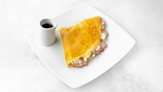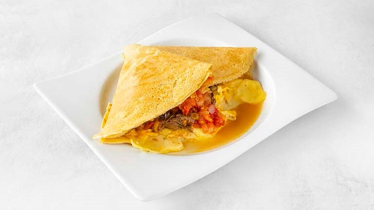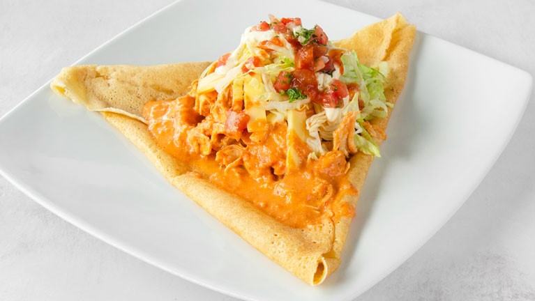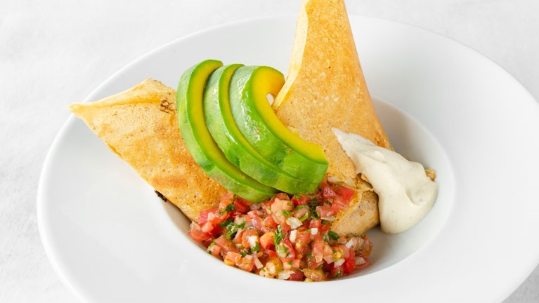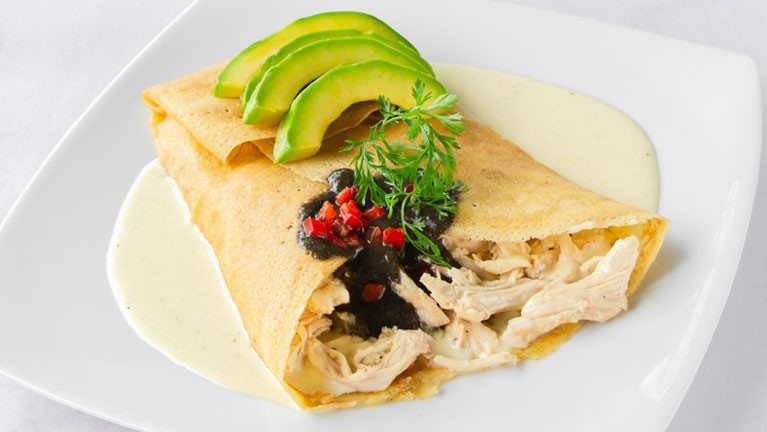 Crepe con mezcla de sabores mexicanos, con huitlacoche, aguacate y salsa de queso.