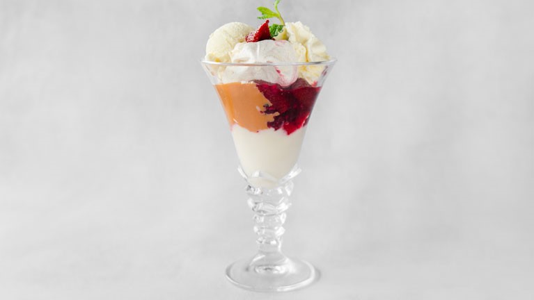 Helado de Vainilla con salsa de arequipe, frutos del bosque, merengue, copos de guanábana y crema chantilly.