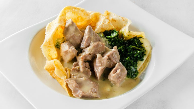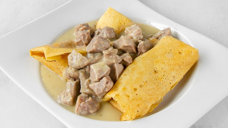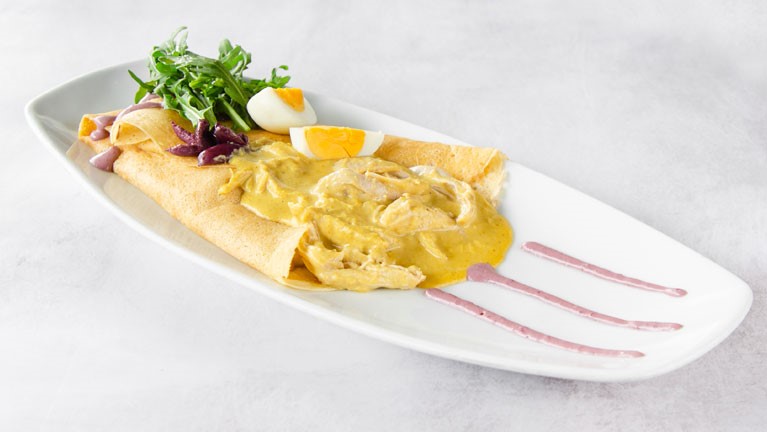 Crepe con típica preparación del ají de gallina limeño, con un ligero toque de picante.