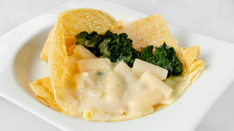 Crepe con espinaca y queso, con clásica salsa de espárragos.