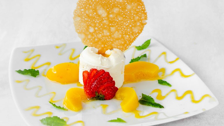 Helado de Yogurt de Maracuyá con coulis de maracuyá, fresas, melocotones y el crujiente de la galleta de encaje.