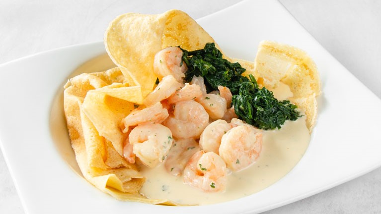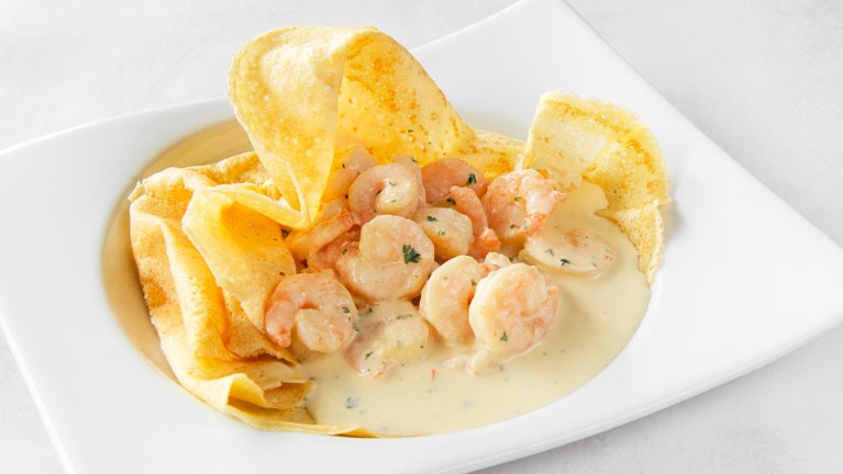Crepe de camarones + espinaca en nuestra salsa al ajillo.