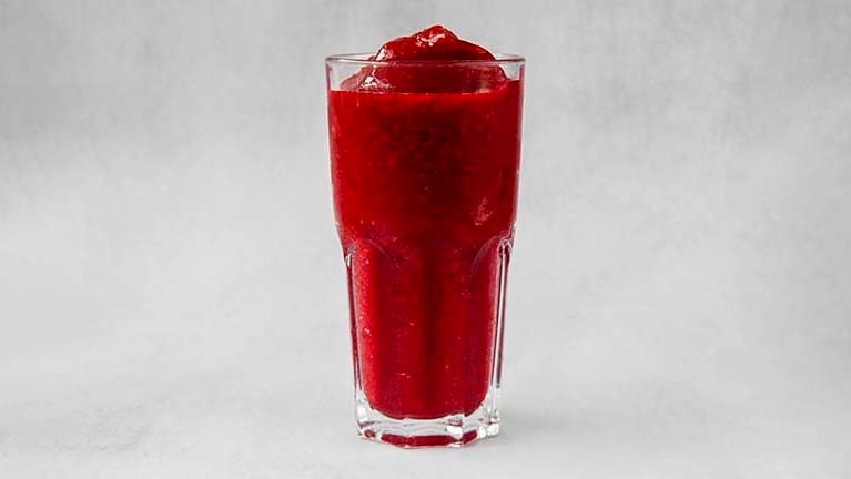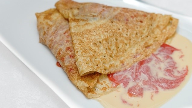 Crepe con tajadas de banano y fresa, helado de Mora, crema chantilly y salsa de frambuesa.