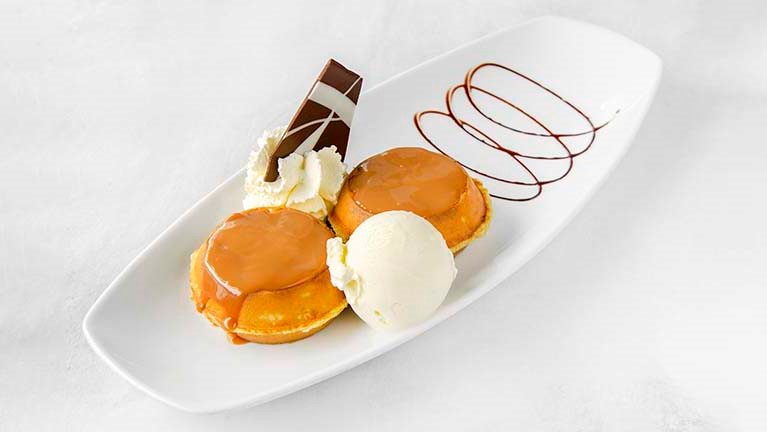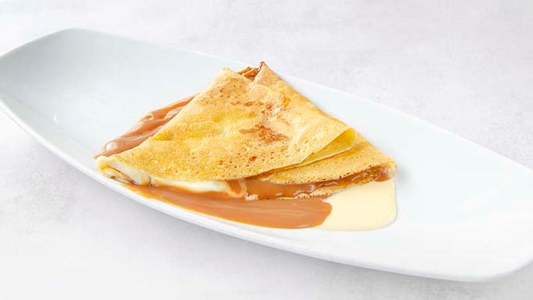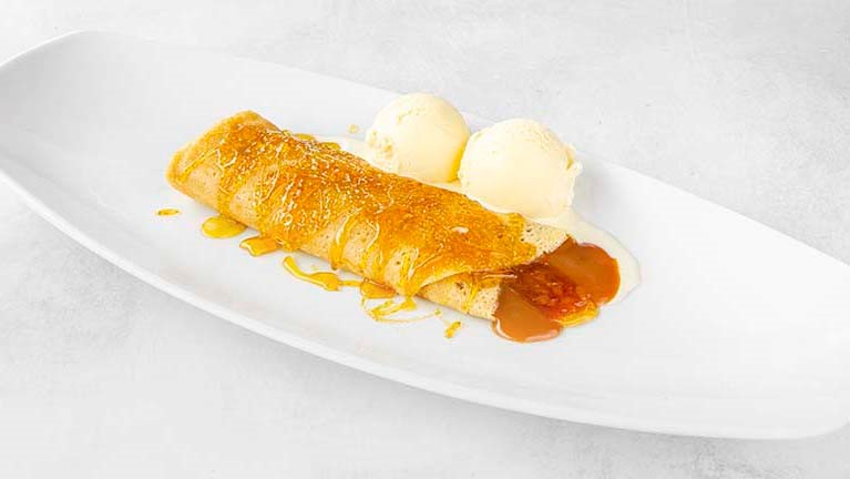 Crepe de arequipe con caramelo crocante flambeado al brandy, acompañado de helado de Vainilla Old Style.