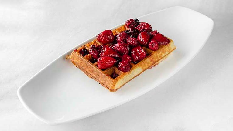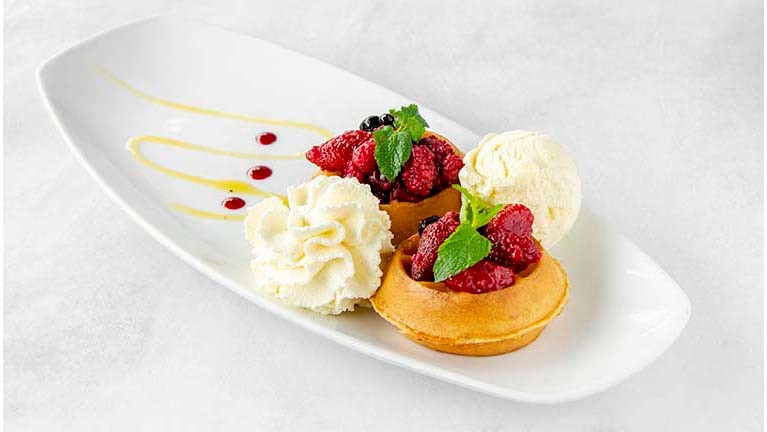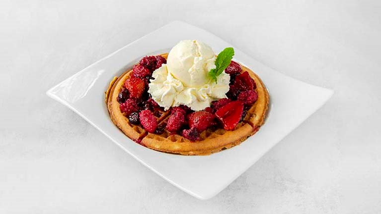 Mini Waffles con frutos rojos, helado de Vainilla y crema chantilly.