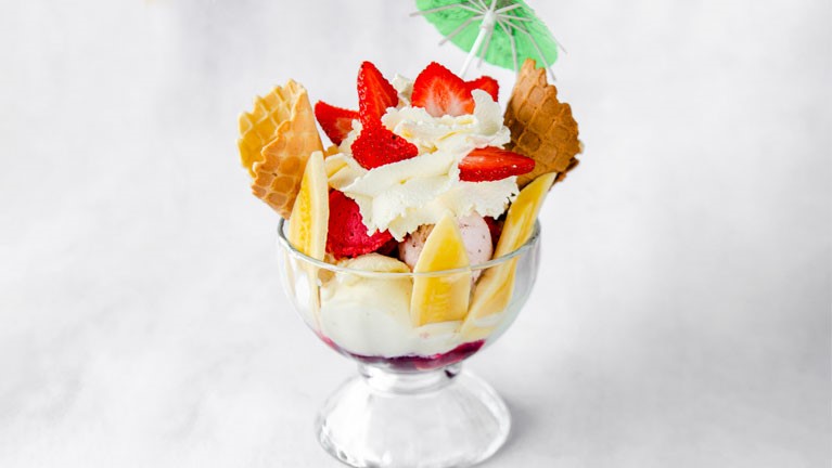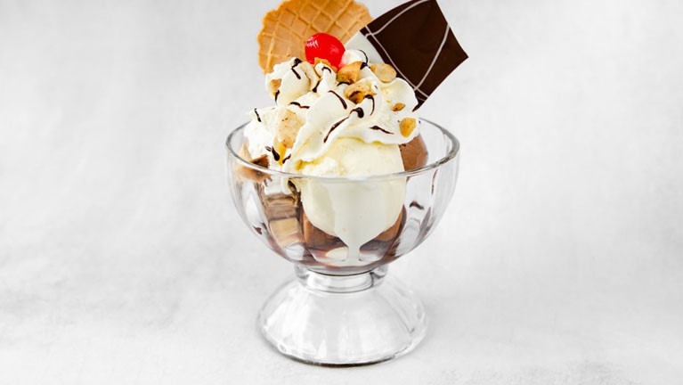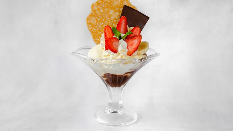 Helado de Vainilla y Chocolate, con fresa, banano, salsa de chocolate, crujiente galleta de encaje y crema chantilly.