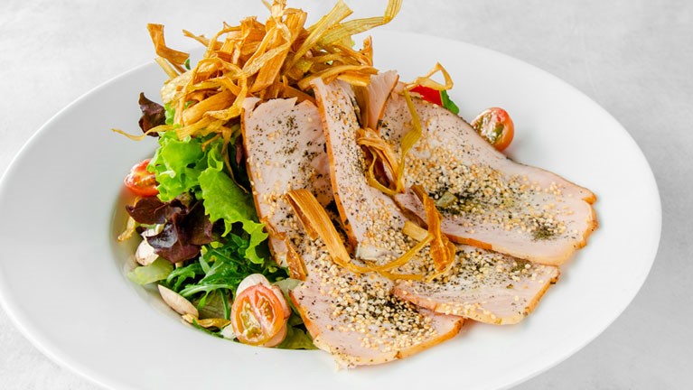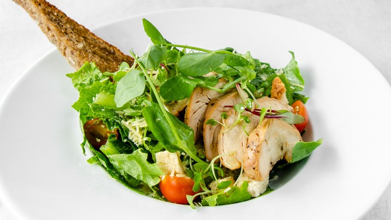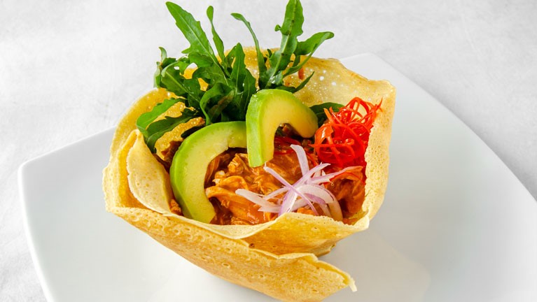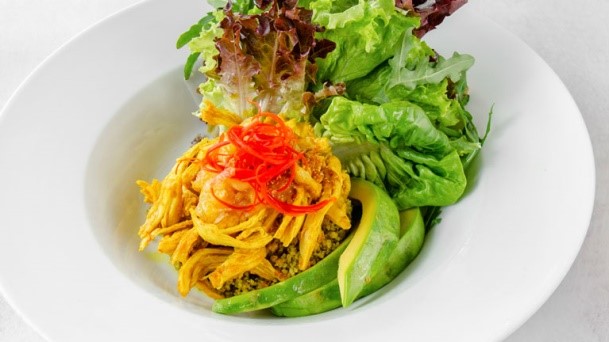 Pollo con todos los sabores del Perú. Pure de frijol al cilantro, aguacate, rúgula, filamentos de pimentón y cebolla roja.