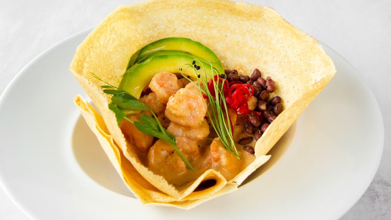 Crepe de camarones en salsa mexicana, con chipotle, arcos de aguacate y frijolitos cuarentanos.