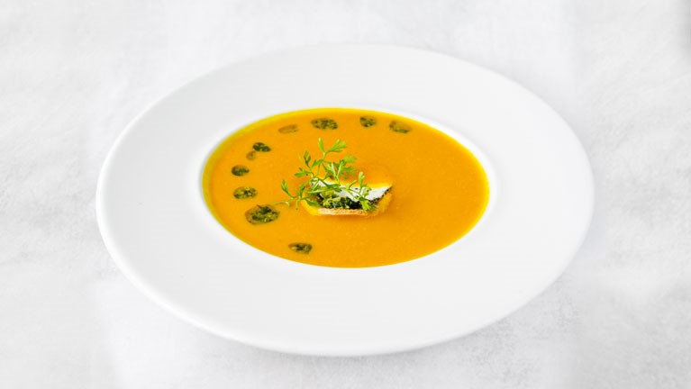 Sopa de zapallo con un toque de queso de cabra y pesto.