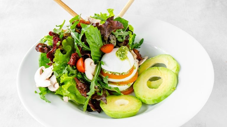 Champiñones salteados, tomates secos, tomates frescos, pesto, reducción de balsámico y mozzarellina.