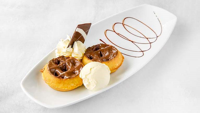 Postre con helado de Vainilla Old Style, bizcochuelo bañado con cognac y entonado con salsas inglesa, chocolate y de café.
