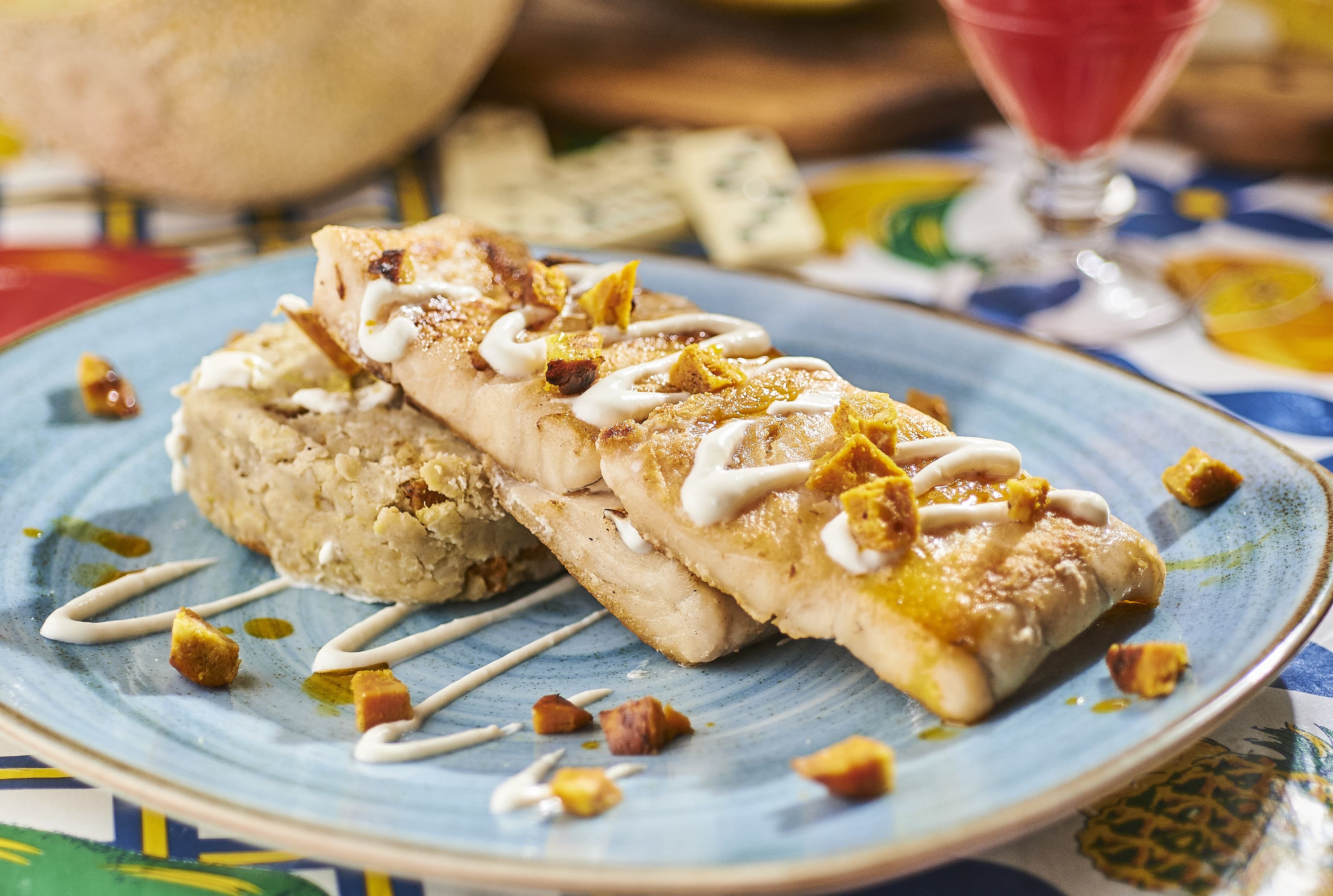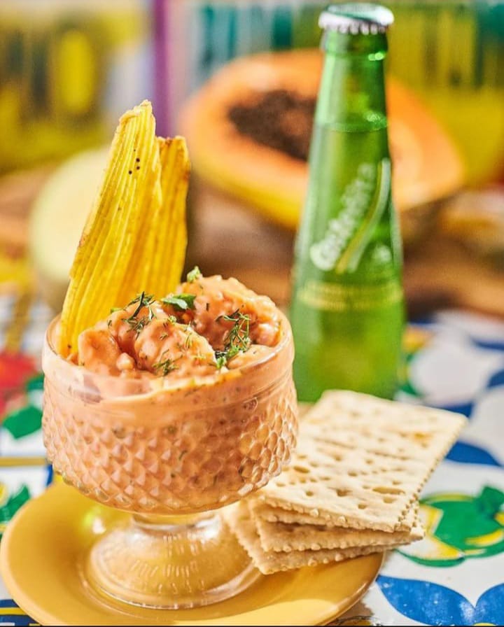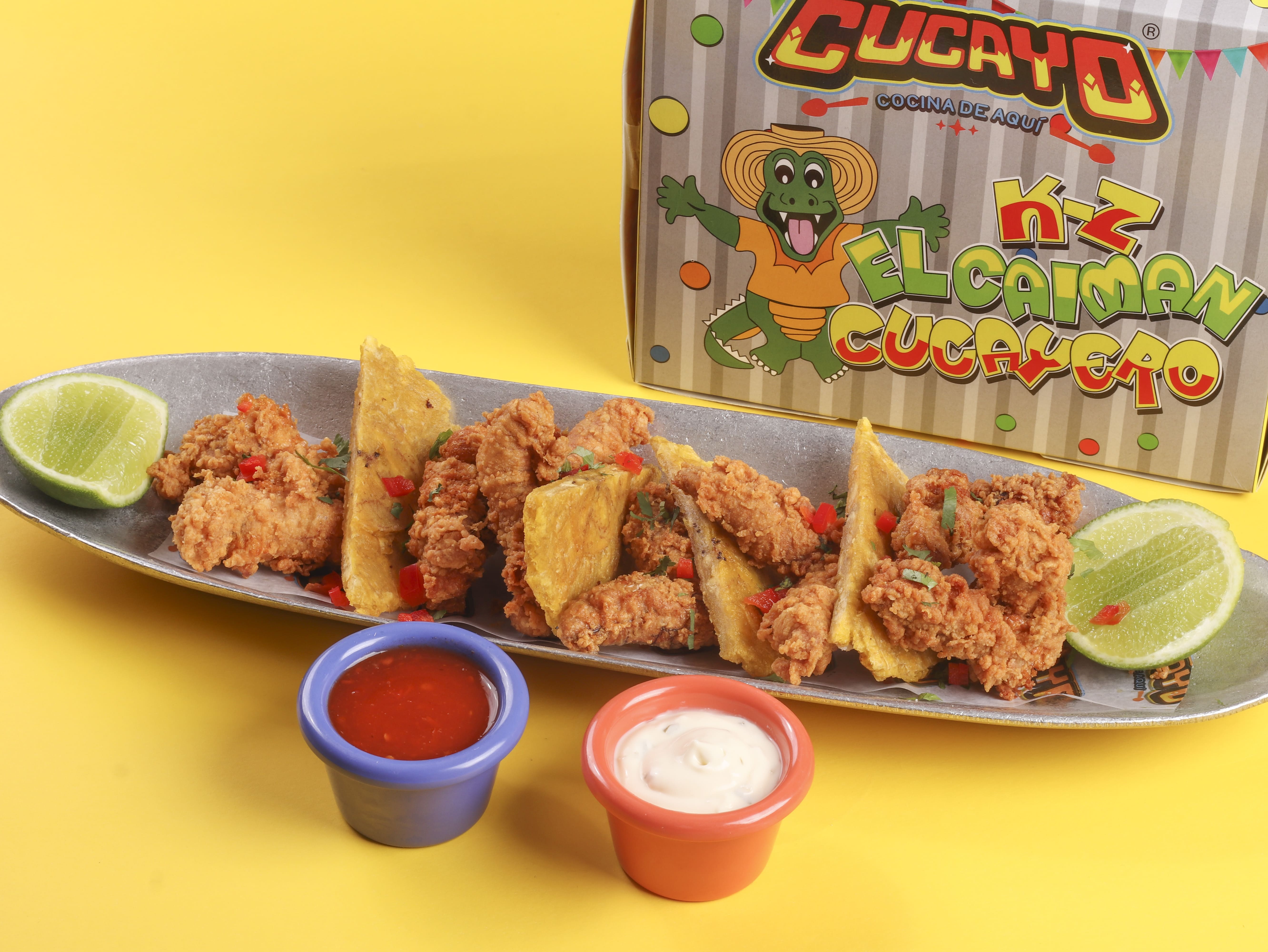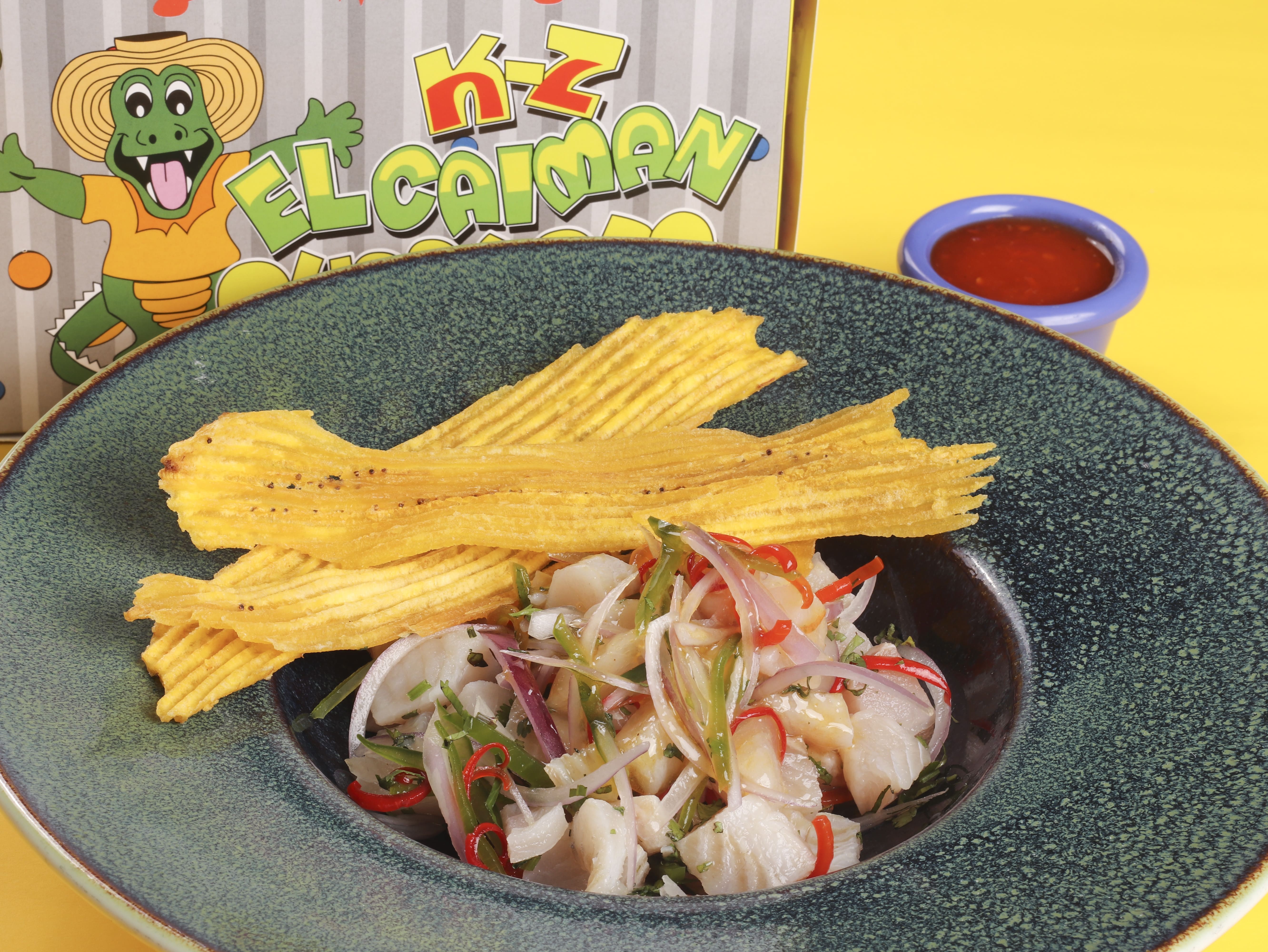 Filete de tilapia y camarón, suero costeño, cebolla roja, pimentones finamente picados, agua de ajo, crocantes de tocineta, acompañado con chips de plátano verde.