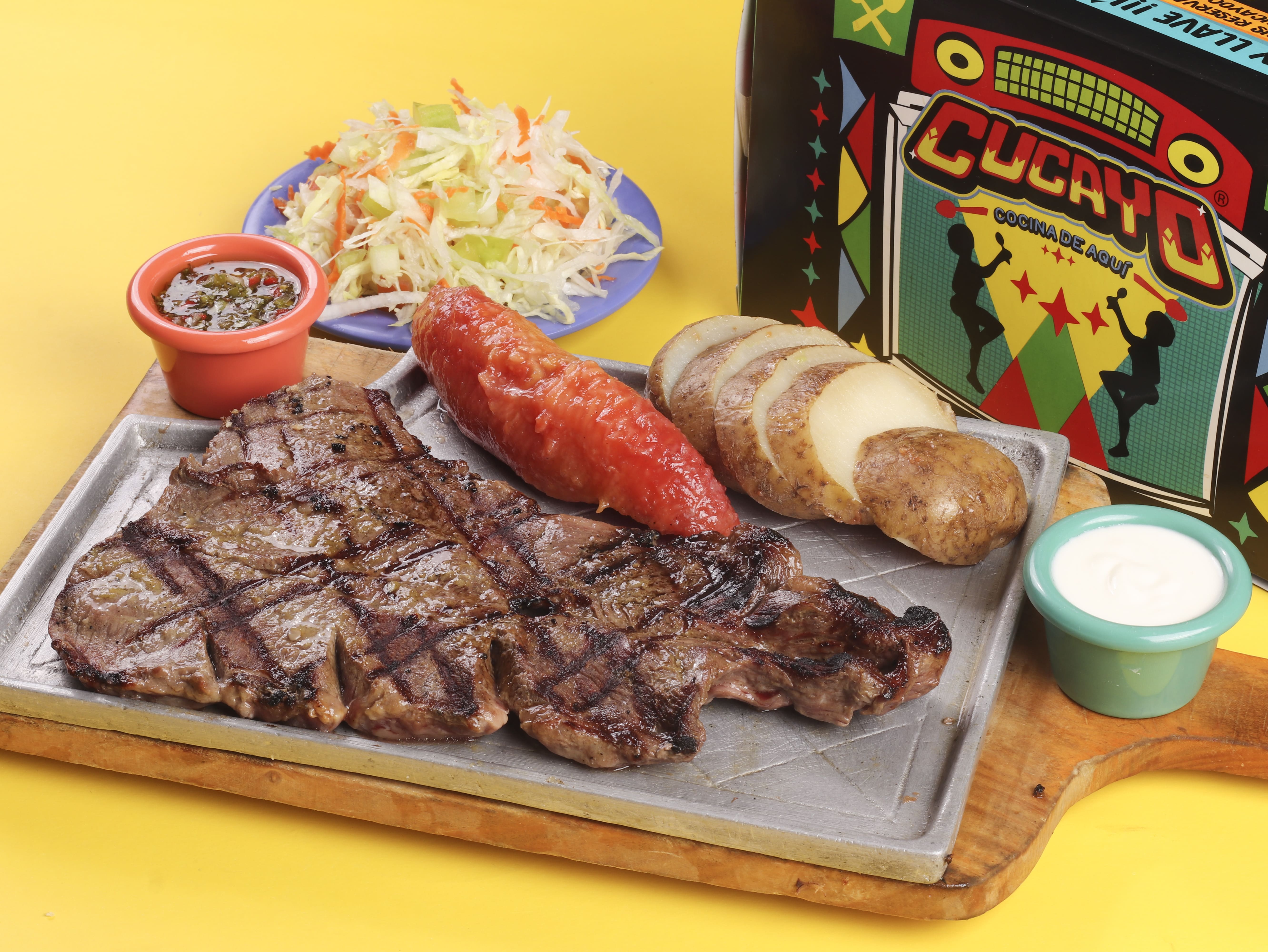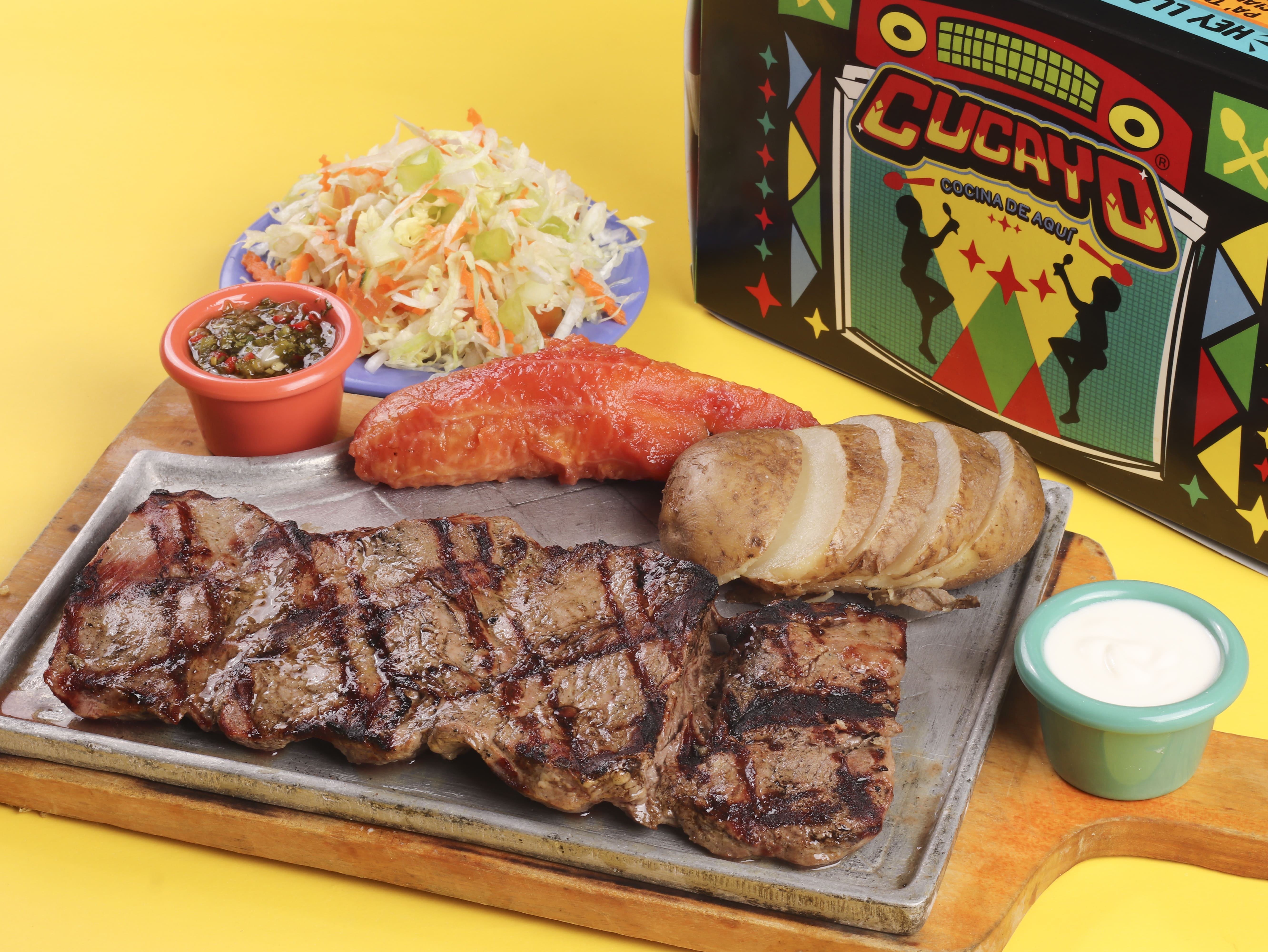 350 g De lomo fino acompañado con yuca o papa a elección, plátano picaro y ensalada del día.