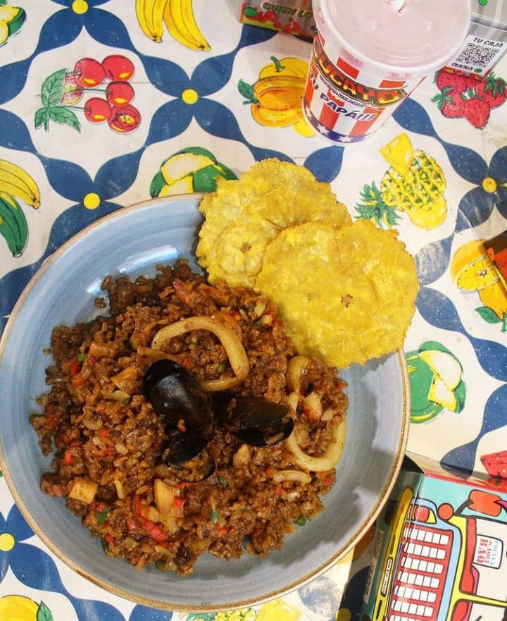 Arroz base leche de coco con mixtura de mariscos (pulpo, tentaculo, camarón, mejillón, anillos de calamar y pescado), acompañado con patacones o papas a la francesa.