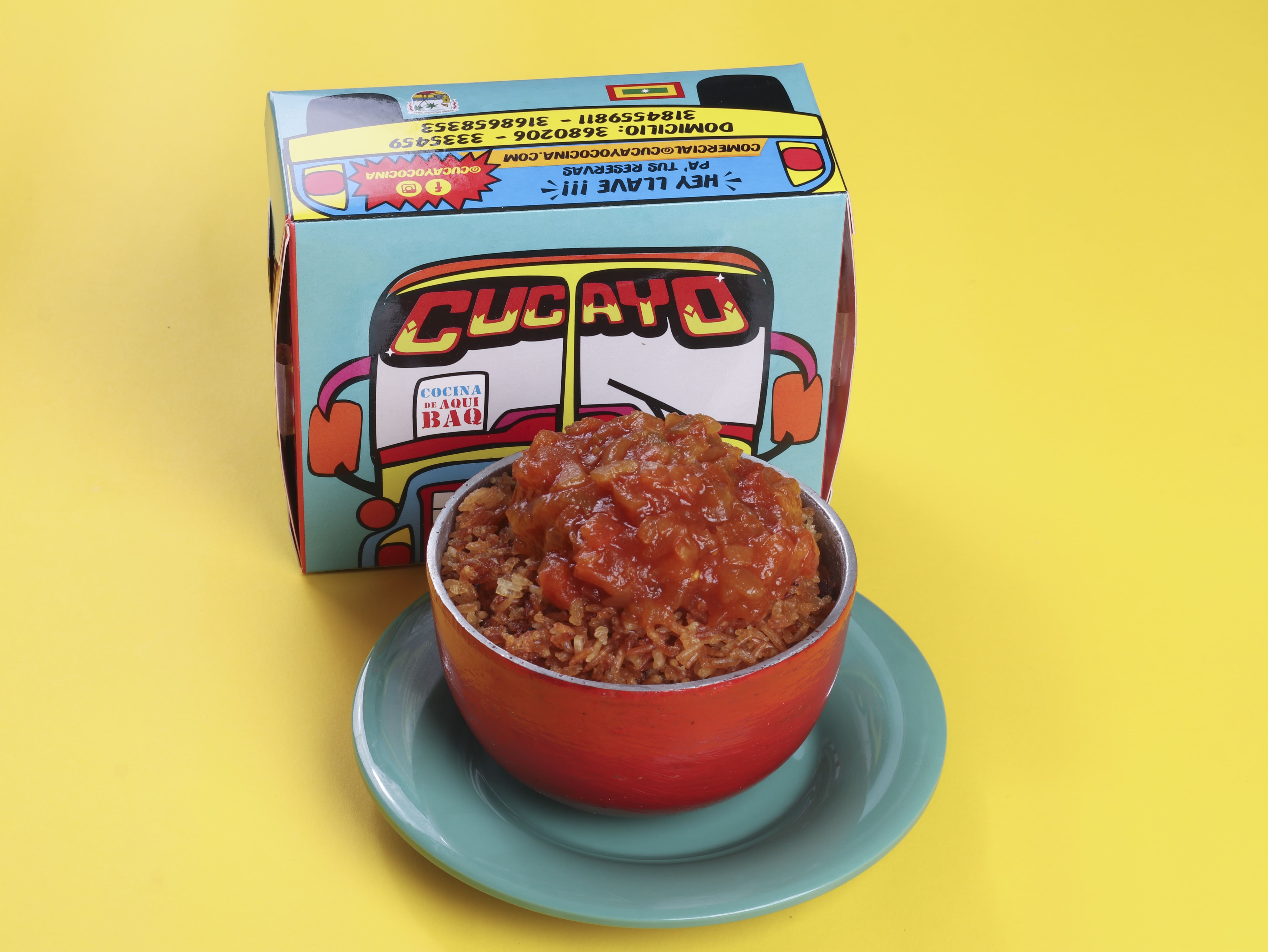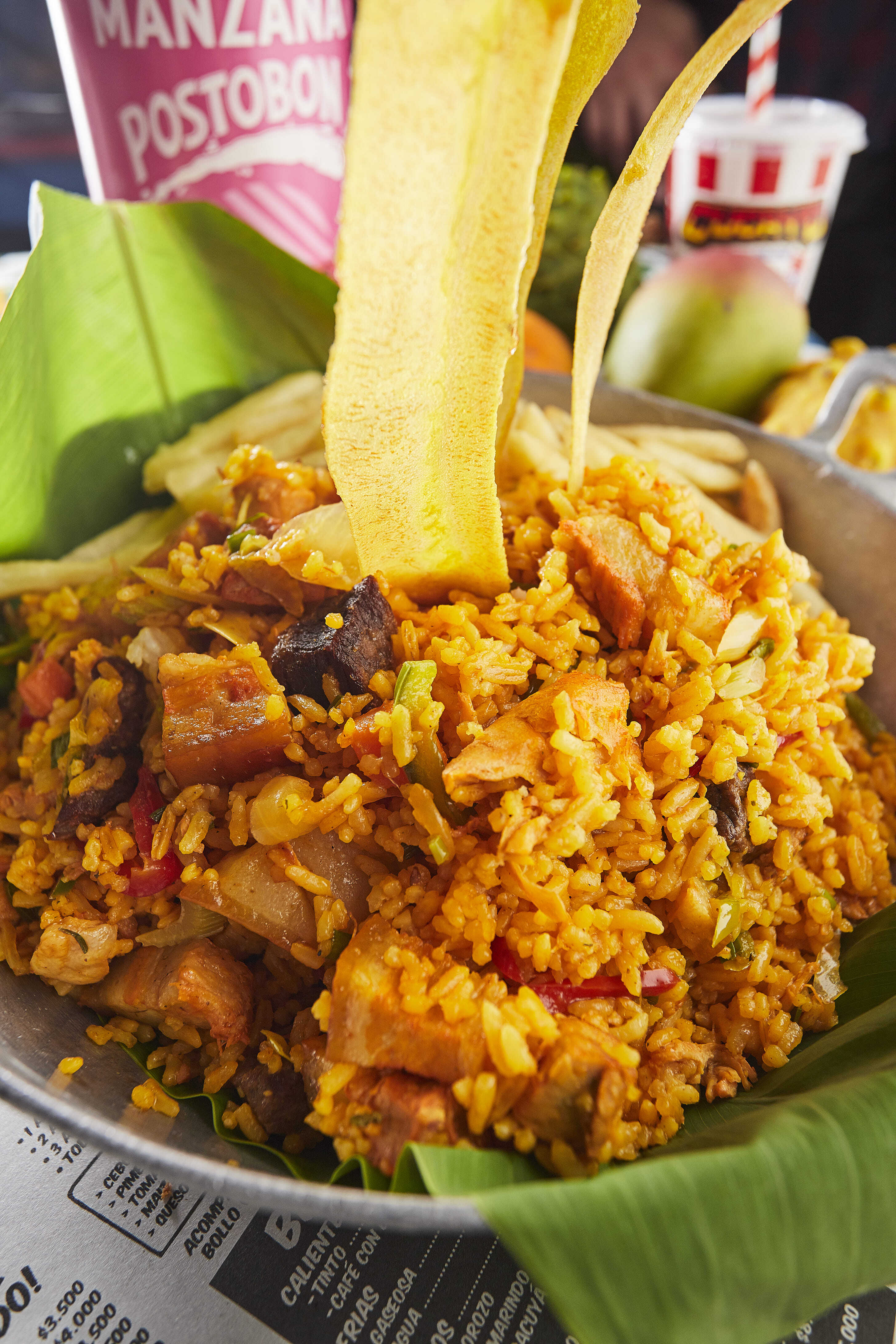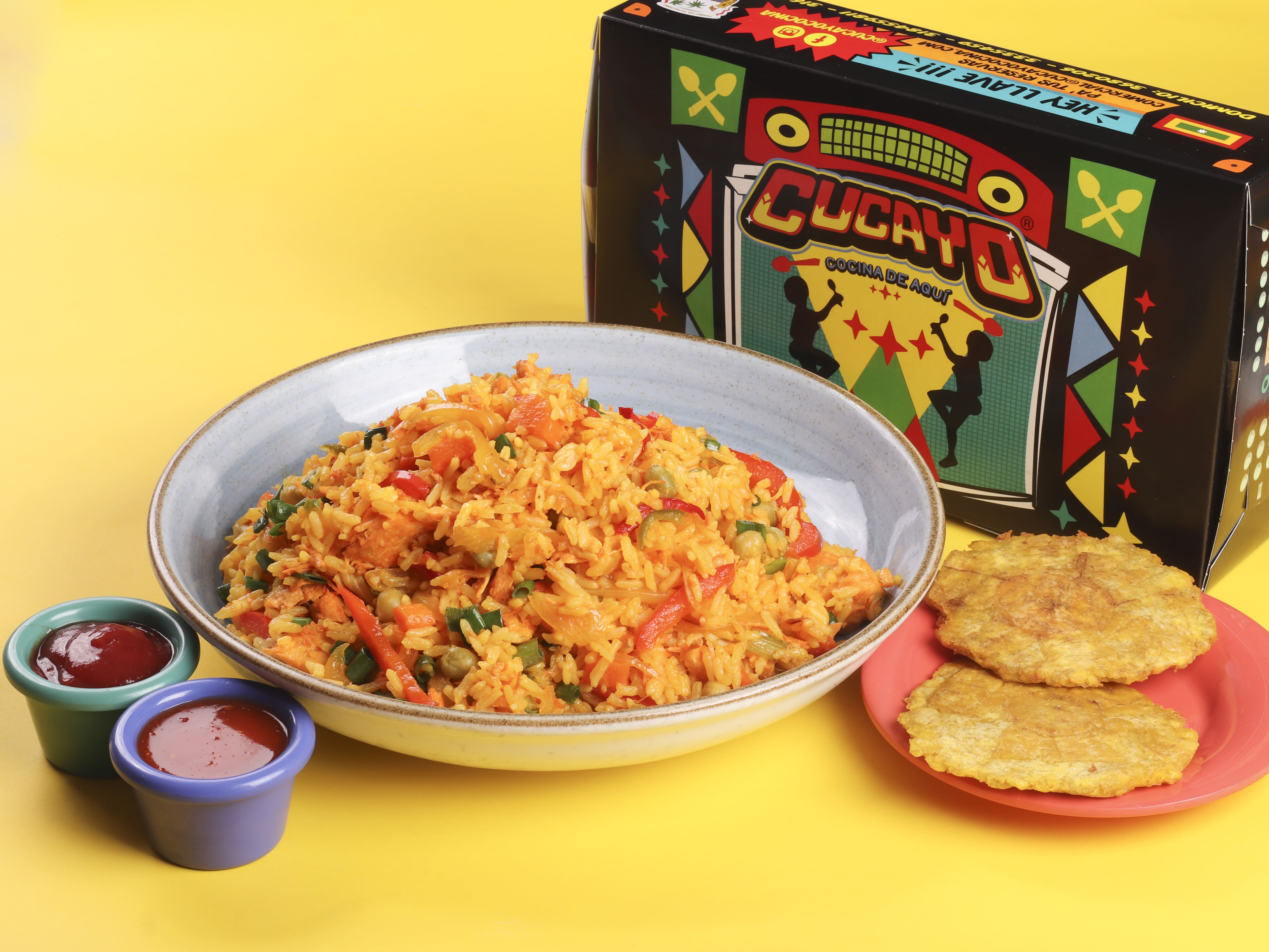 1400 g De arroz y proteína de pechuga, res y cerdo, vegetales (pimentón, cebolla blanca, zanahoria, cebolla junca), acompañado con patacones o papas a la francesa, gaseosa Postobón 2 L sabores a elección.