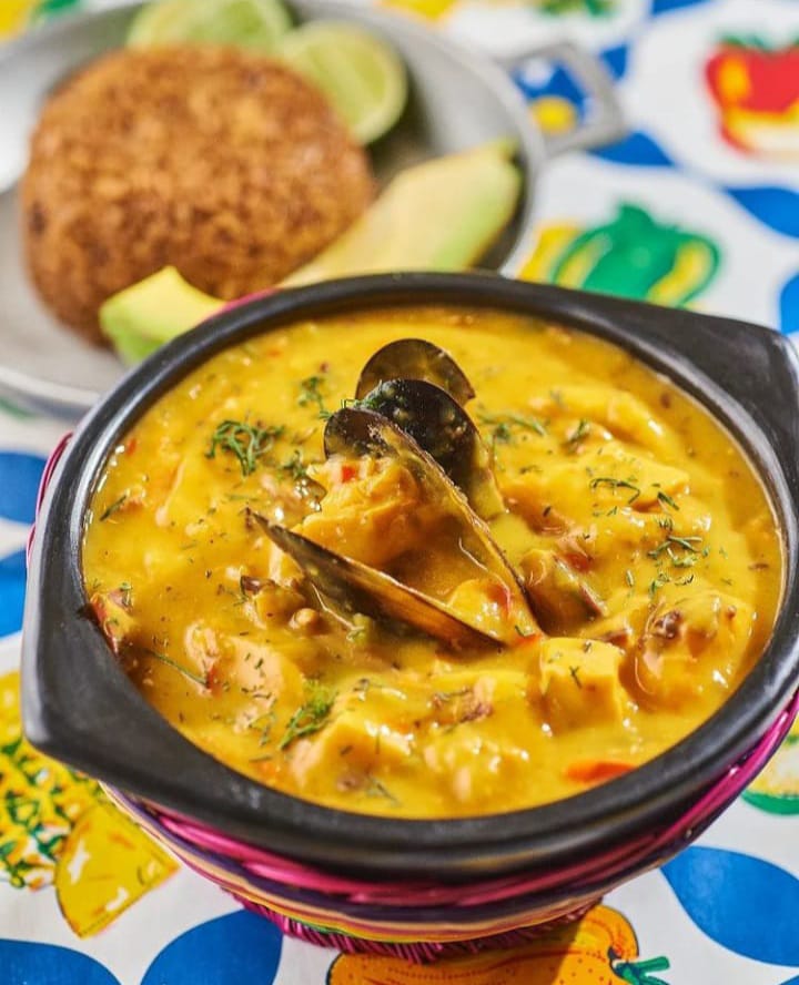 Sopa a base de mondongo, pata de res, pulpa de cerdo, chorizo, plátano verde, zanahoria, maíz, yuva, ñame, ahuyama, apio, cilantro, cebolla roja, ají topito, cebolla larga, cebollín chino, acompañado con arroz blanco y aguacate.