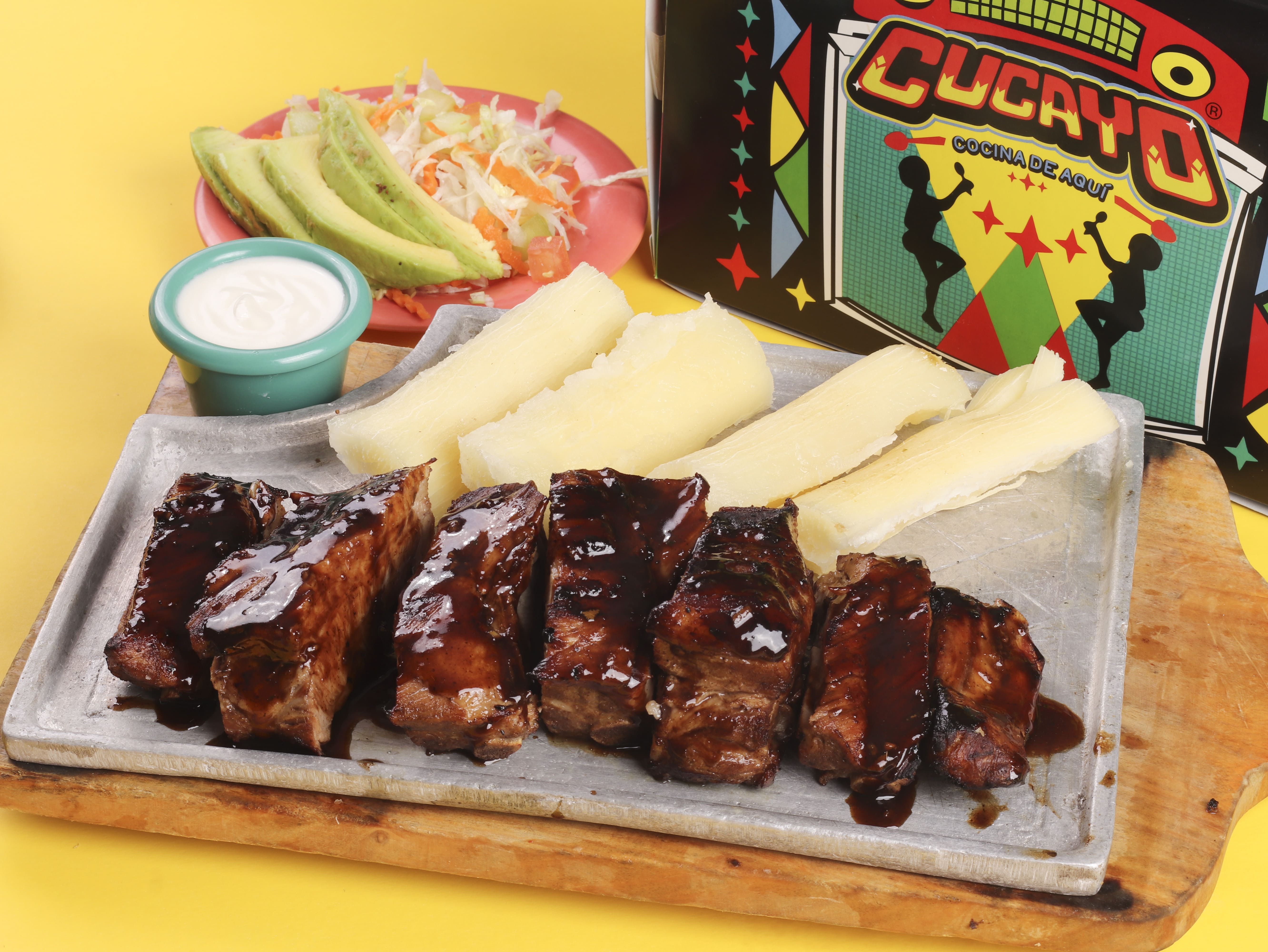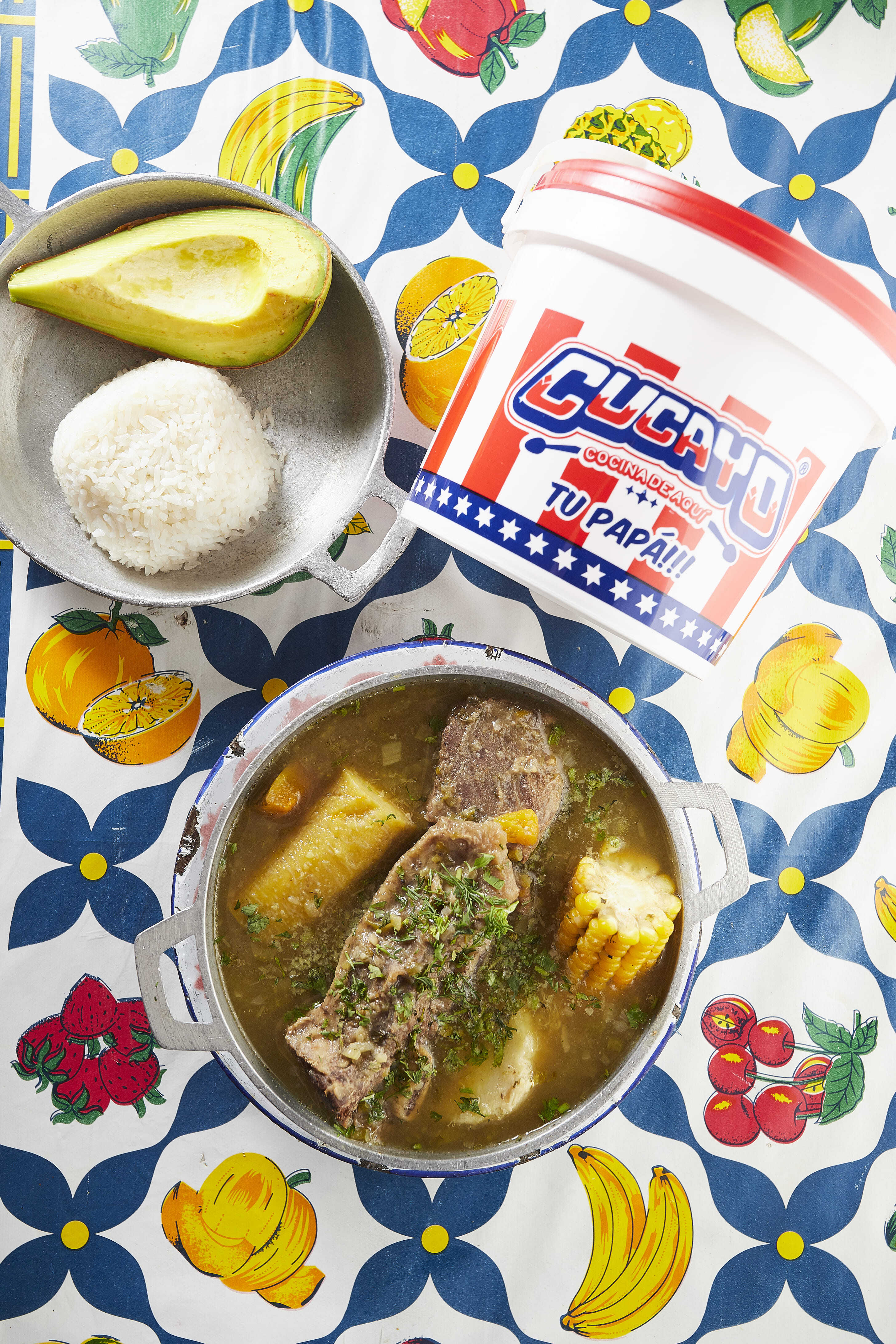 350 g De asado de tira (costilla), caldo con papa blanca, plátano verde, mazorca, yuca, cilantro, ajo, cebolla junca, acompañado con arroz blanco y aguacate.