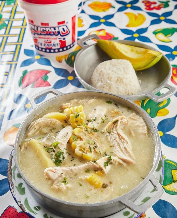 Sopa a base de p ollo, con tres clases de papa (ica, criolla y pastusa), con guasca seca, mazorca bogotana, caldo de gallina, crema de leche, pechuga desmechada y alcaparra, acompañado con arroz blanco y aguacate.