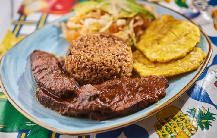 300 g De lengua de res en salsa agridulce acompañado con arroz de coco, patacones y ensalada del día.