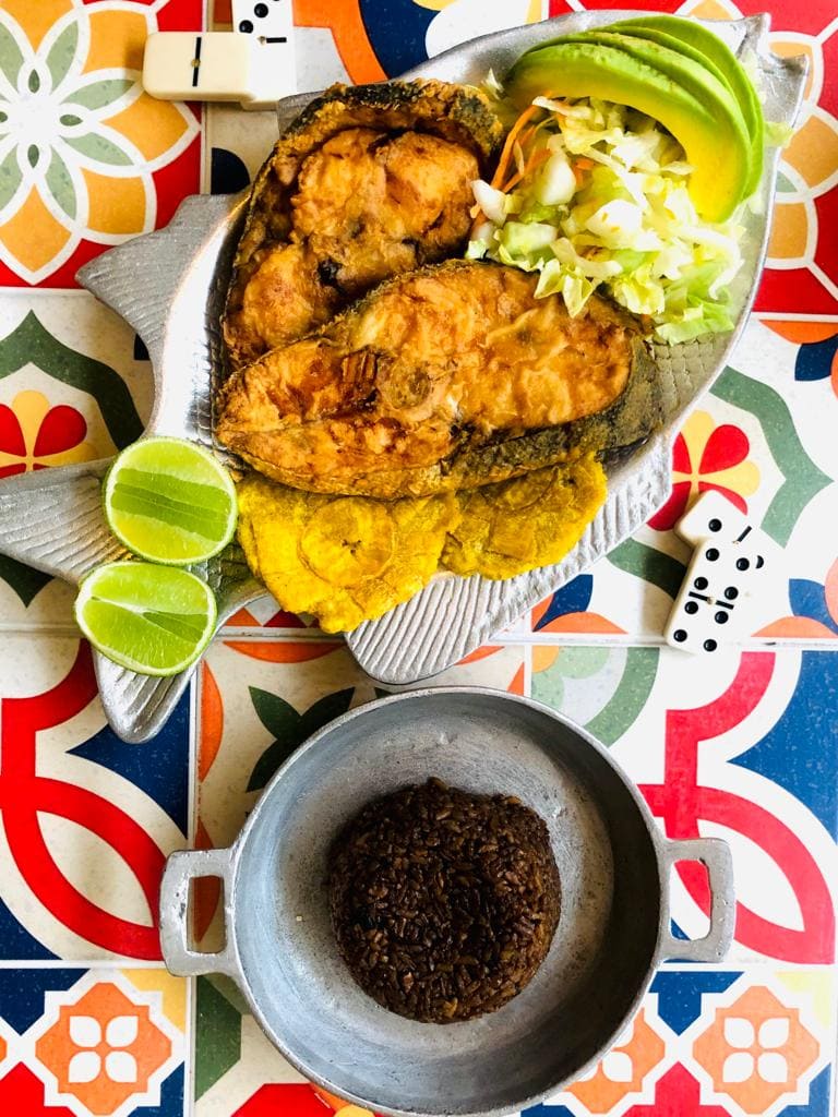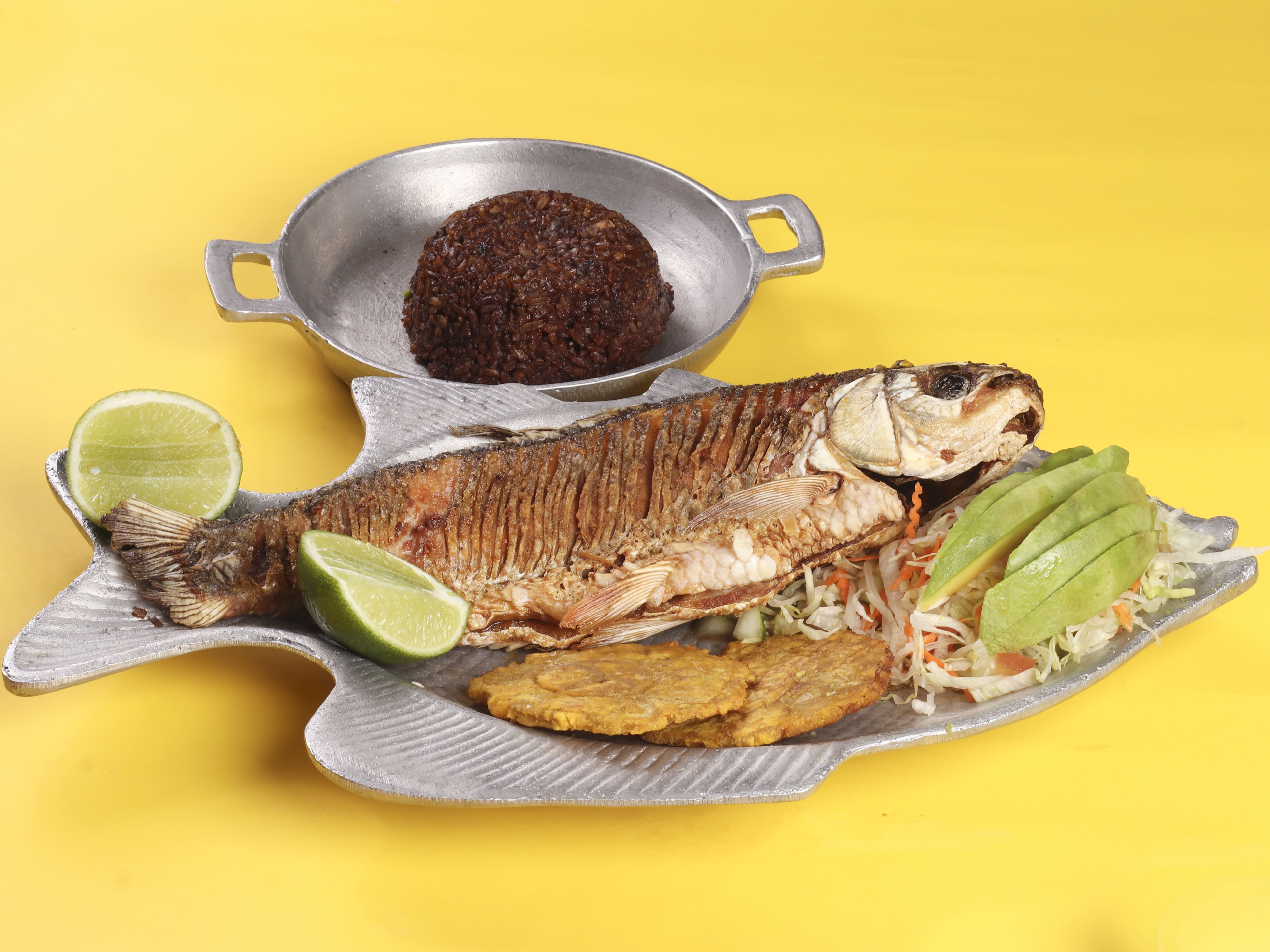 750 g De bocachico frito acompañado con arroz de coco, patacón, aguacate y ensalada del día.