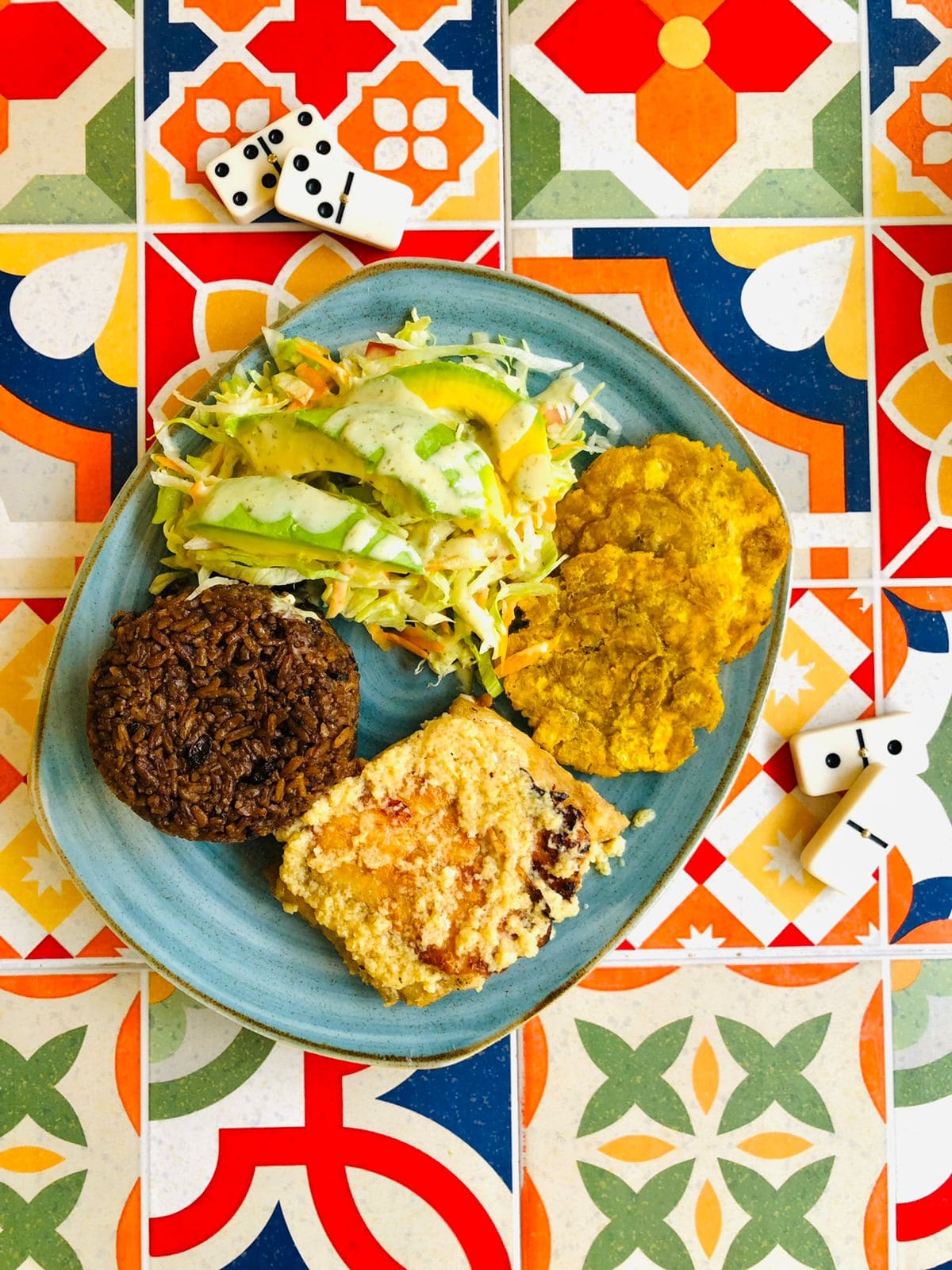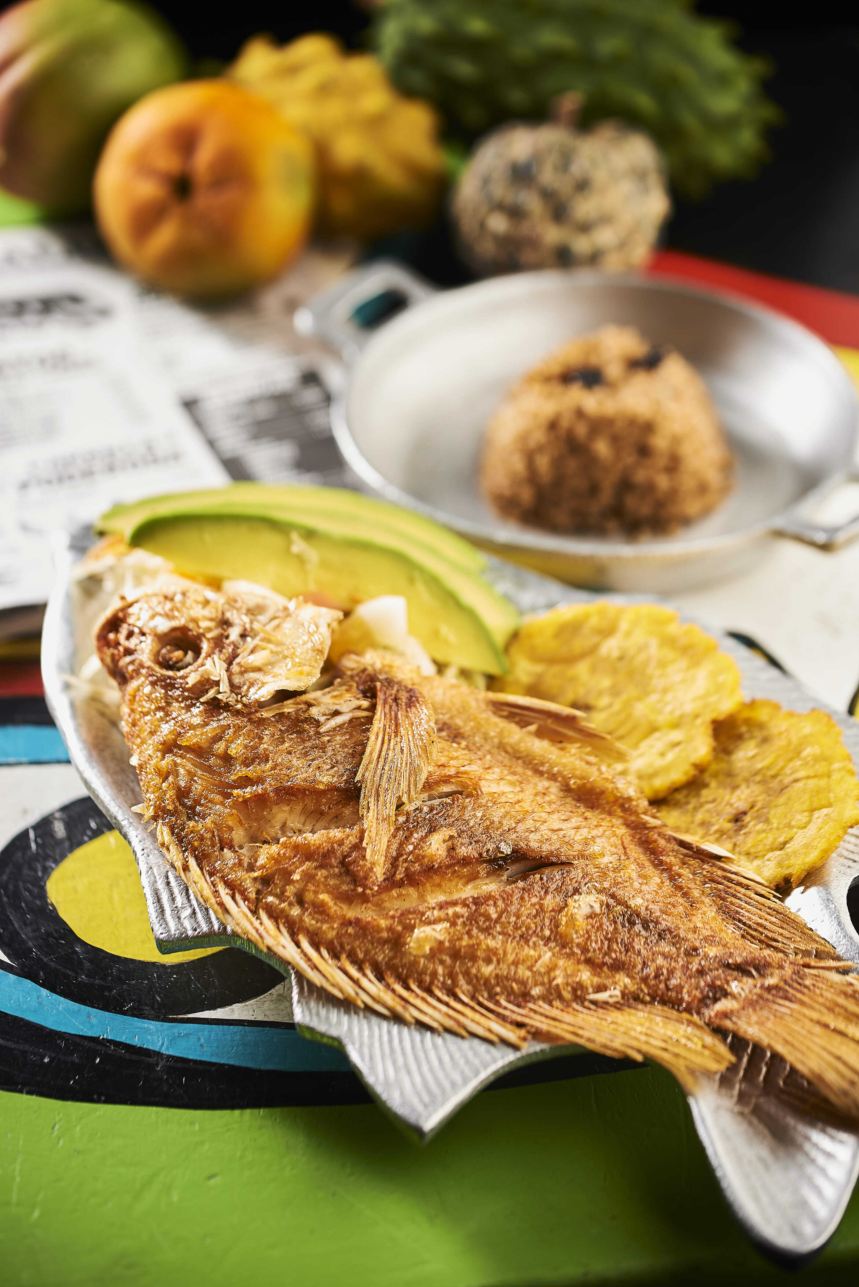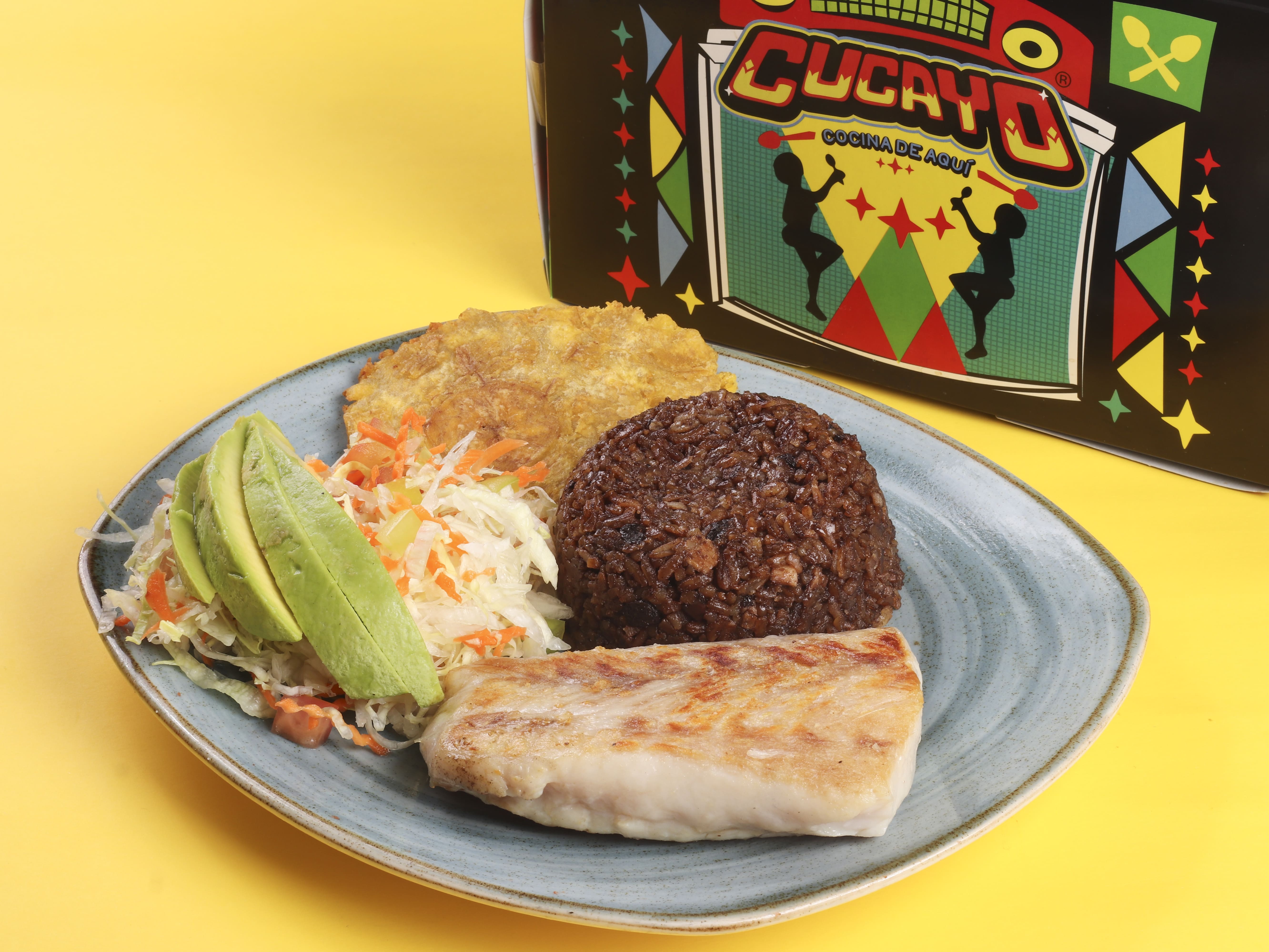 550 g De tilapia roja frita acompañado con arroz de coco, patacón, aguacate y ensalada del día.