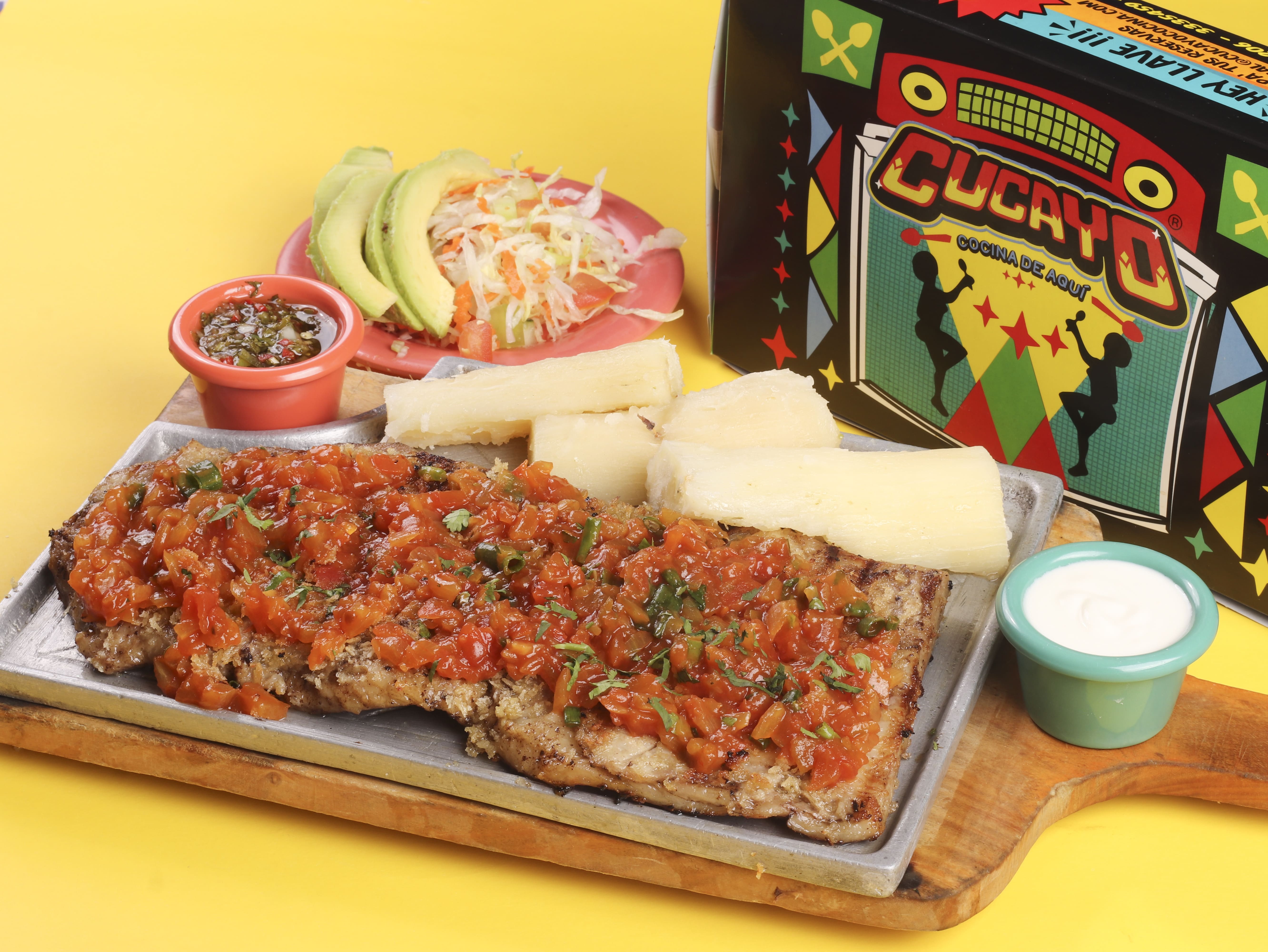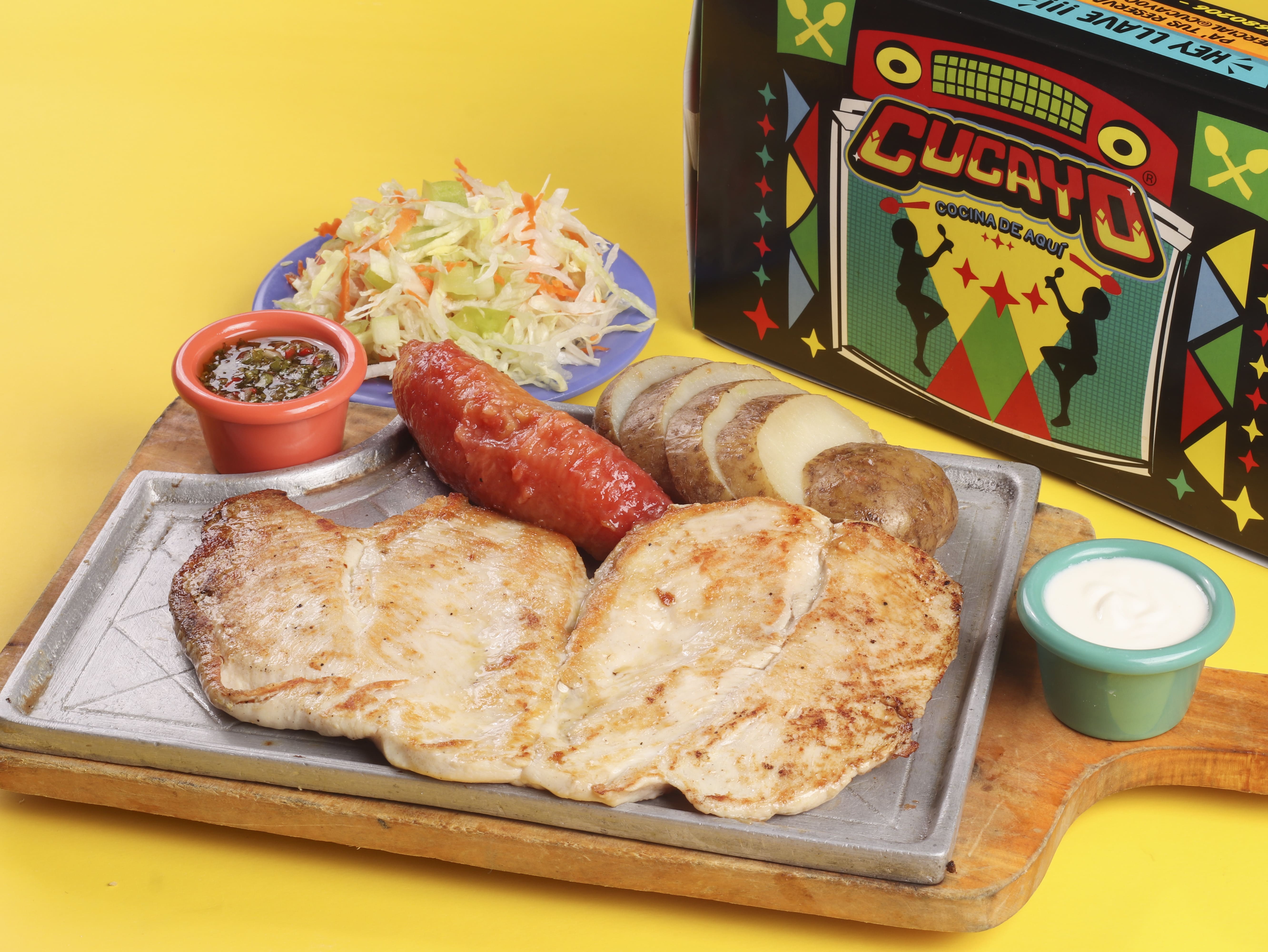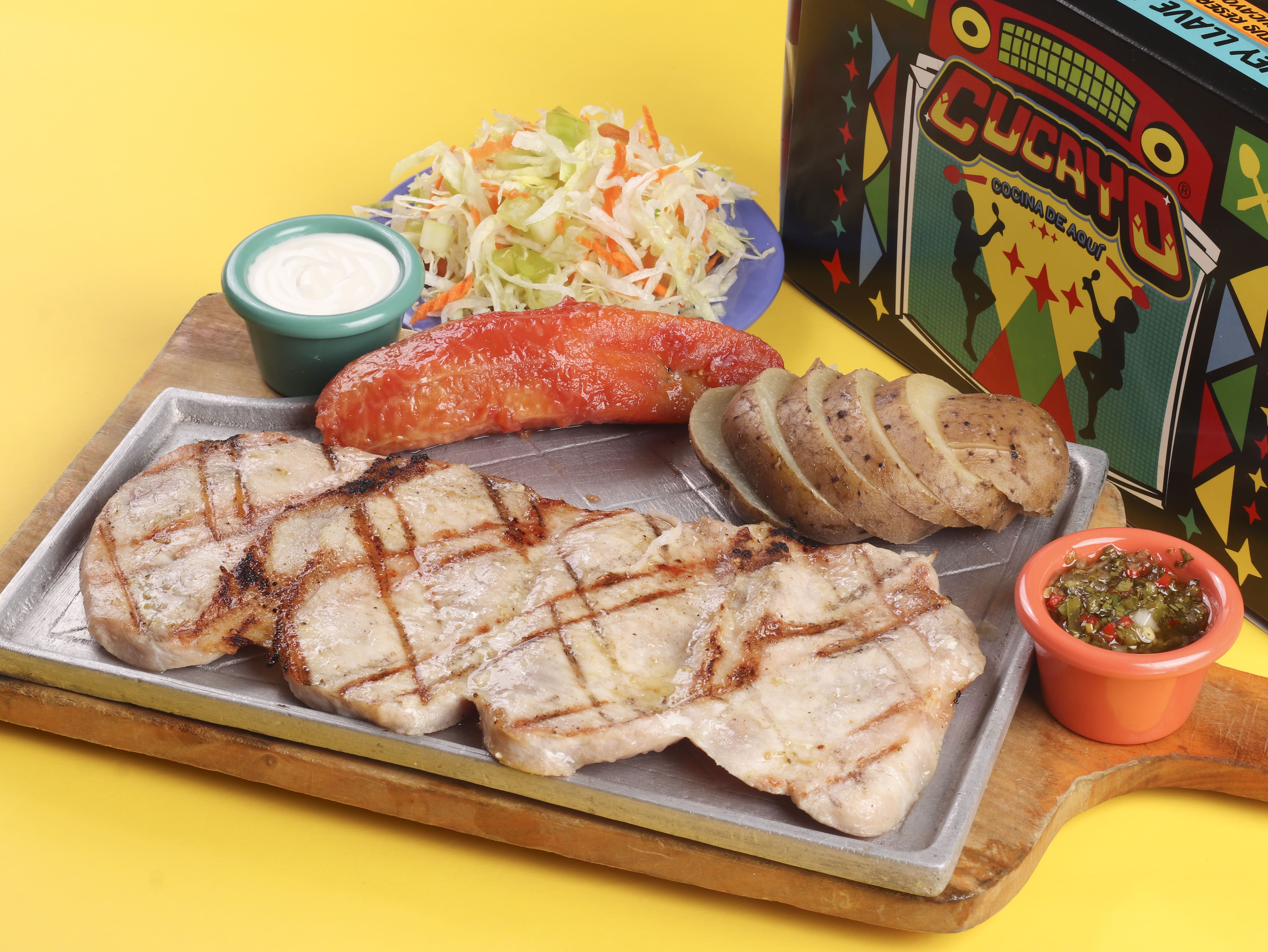 350 g De lomo de cerdo acompañado de yuca o papa a elección, plátano picaro y ensalada del día.