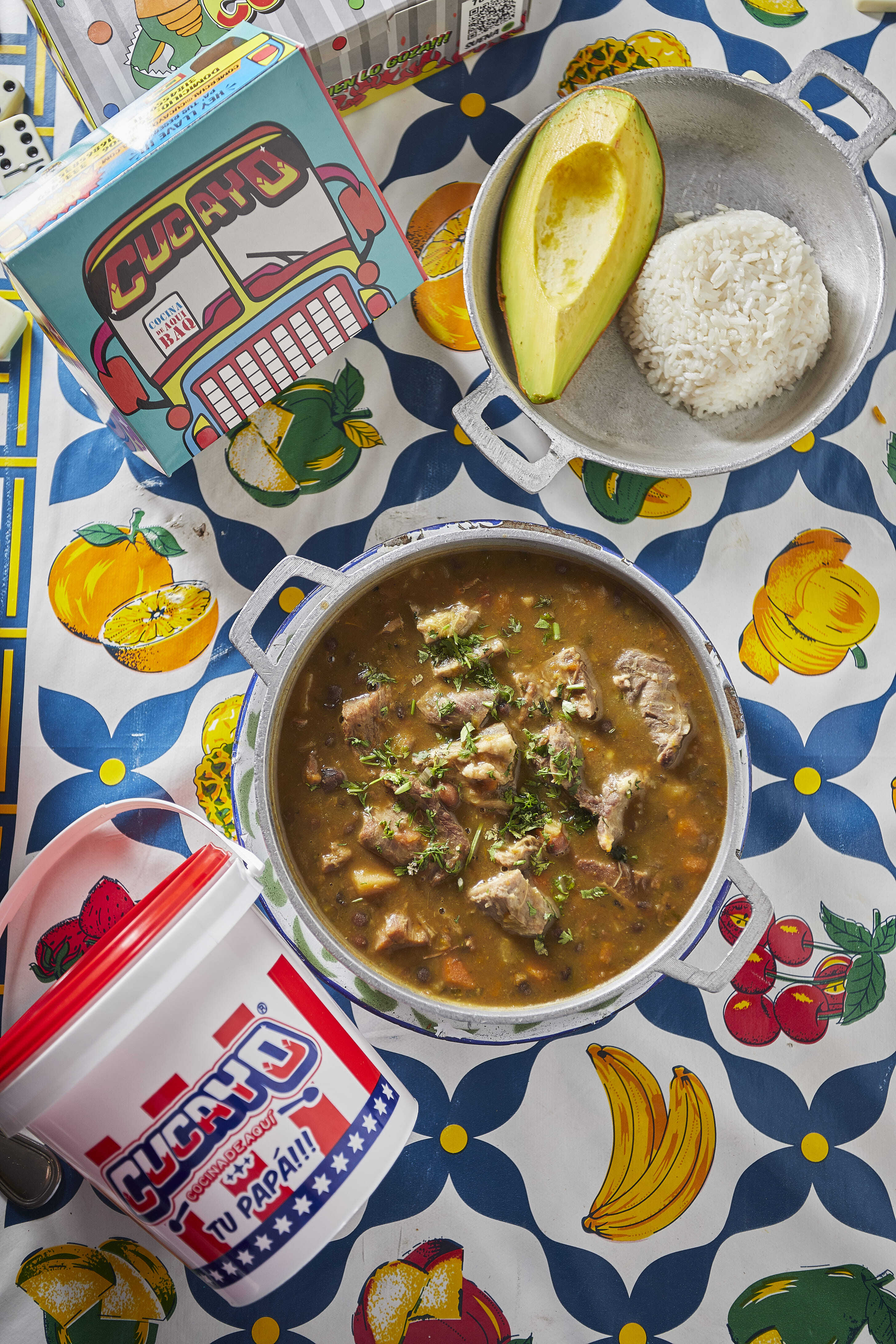 Sopa de cereal de guandú con carne de res salada, plátano verde, zanahoria, maíz, yuva, ñame, ahuyama, apio, cilantro, cebolla roja, ají topito, cebolla larga, cebollín chino, acompañado con arroz blanco y aguacate.