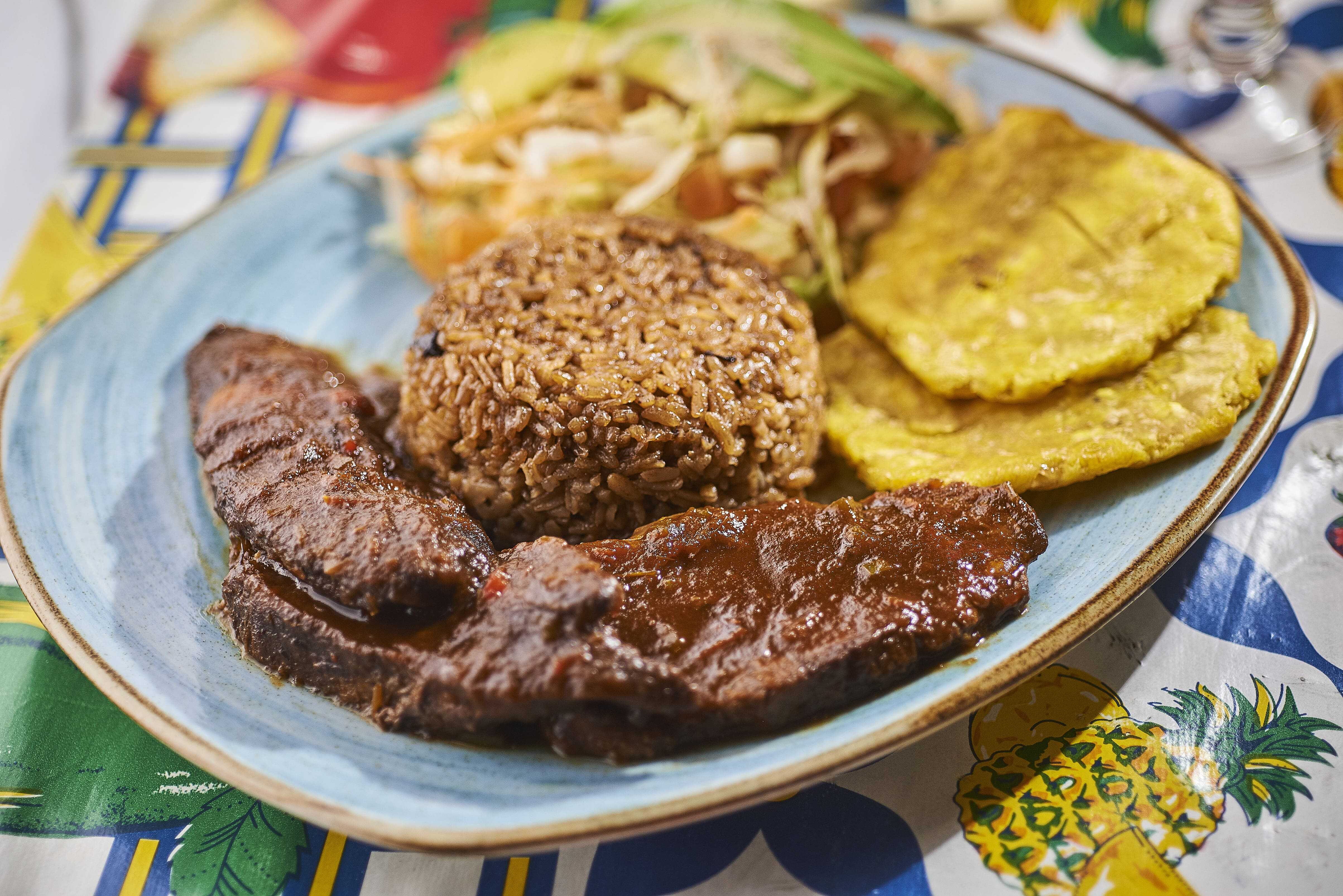 350 g De muchacho de res en salsa a base de panela y soya, acompañado con arroz de coco, patacones y ensalada del día.
