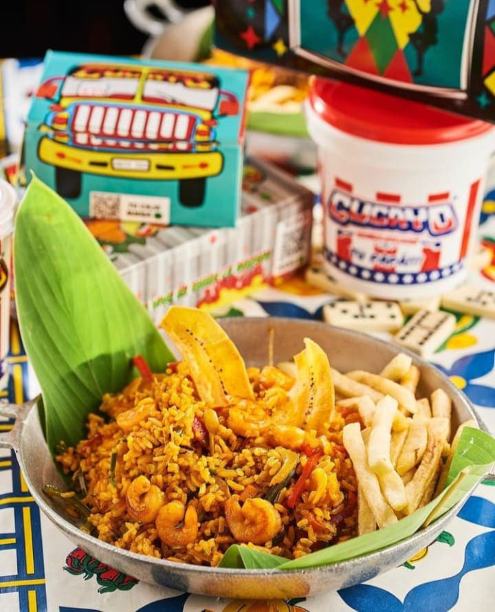Arroz caldoso con 200 g de camarón crudo 5160, 100 g de chorizo artesanal, con nivel de picante moderado, acompañado de patacones o papas a la francesa.