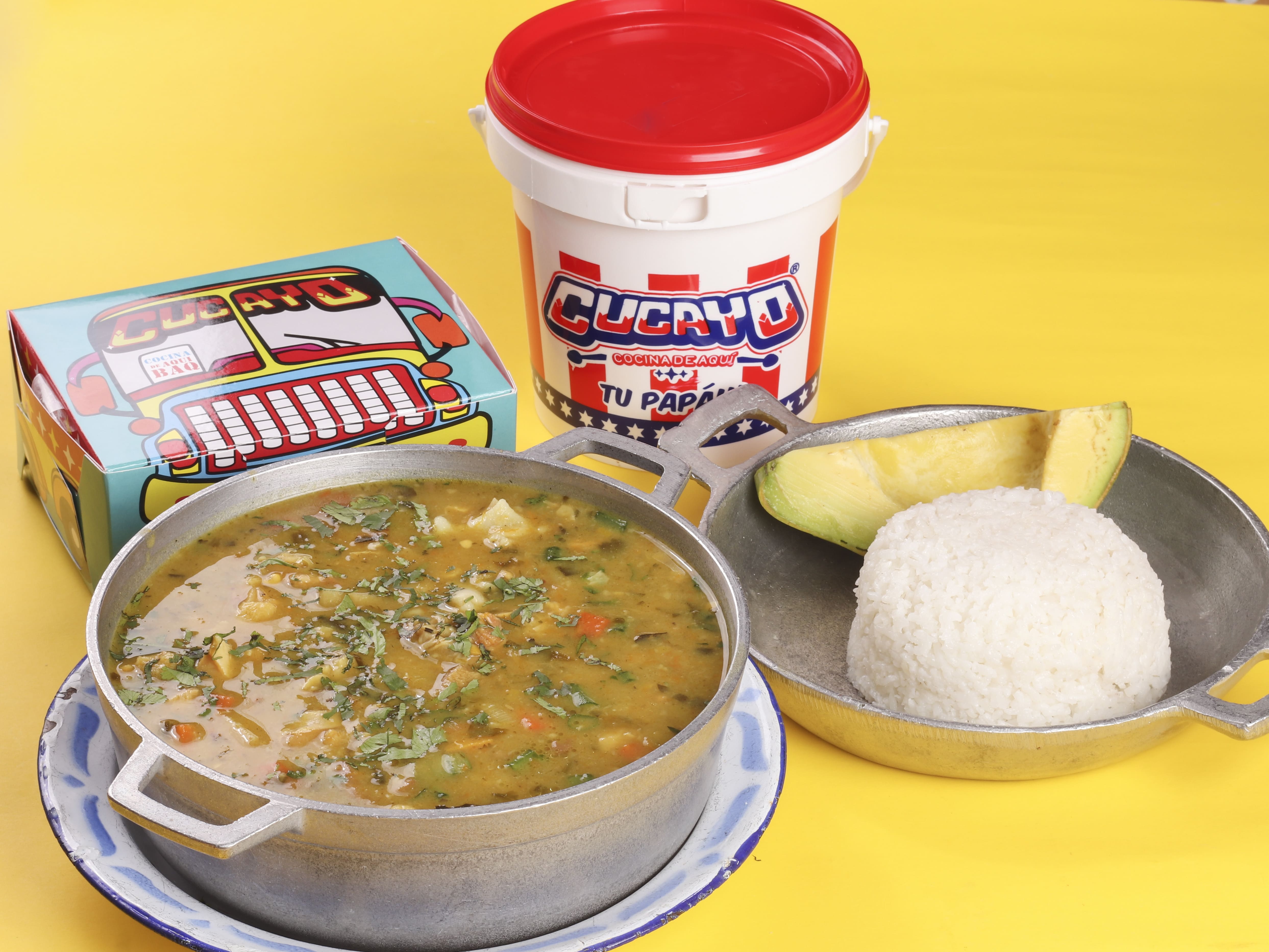 Un cuarto de gallina criolla, caldo con papa blanca, plátano verde, mazorca, yuca, cilantro, ajo, cebolla, cebolla junca, acompañado con arroz blanco y aguacate.