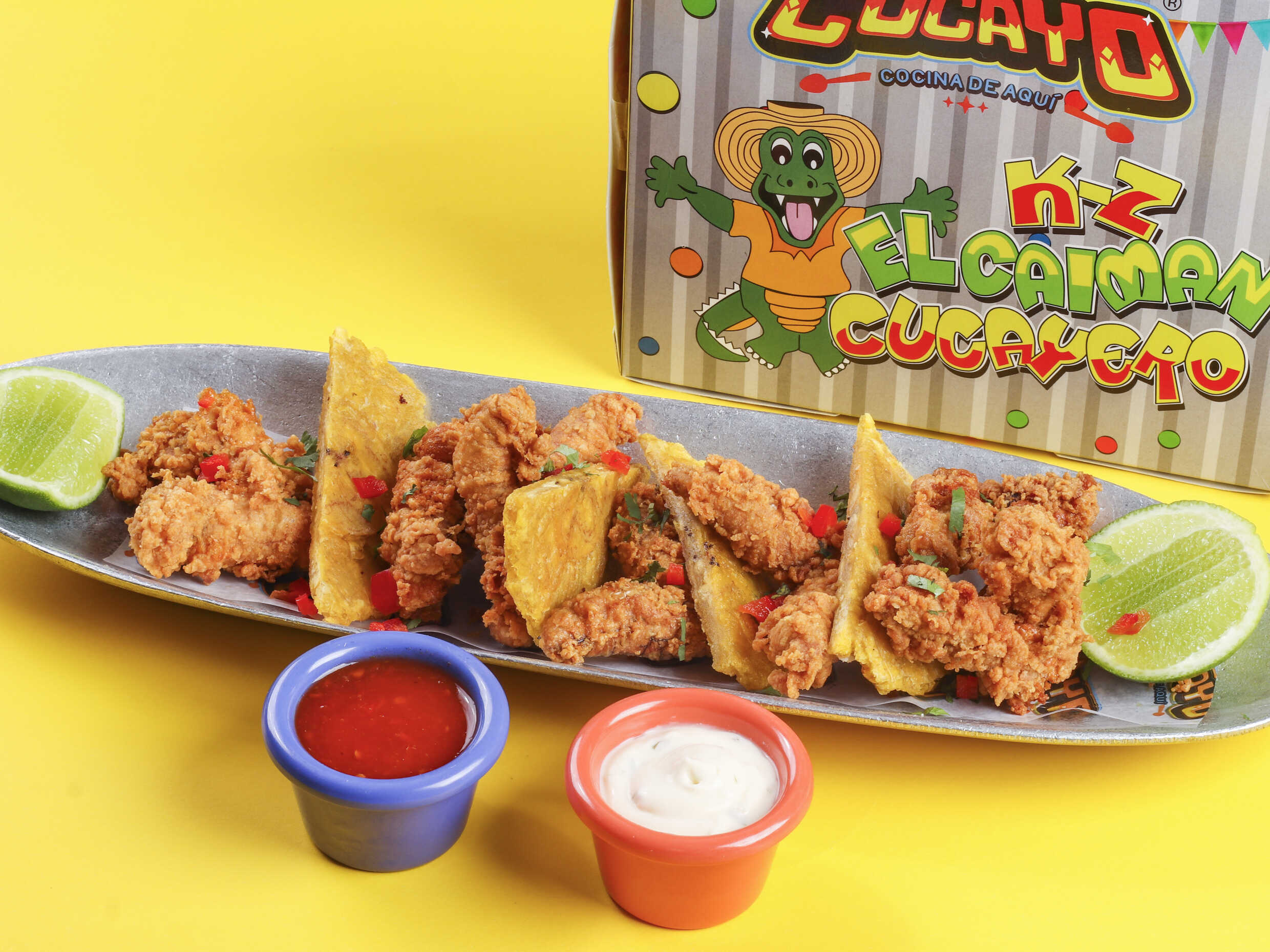 Filete de tilapia y camarón, suero costeño, cebolla roja, pimentones finamente picados, agua de ajo, limón, acompañado con chips de plátano verde.