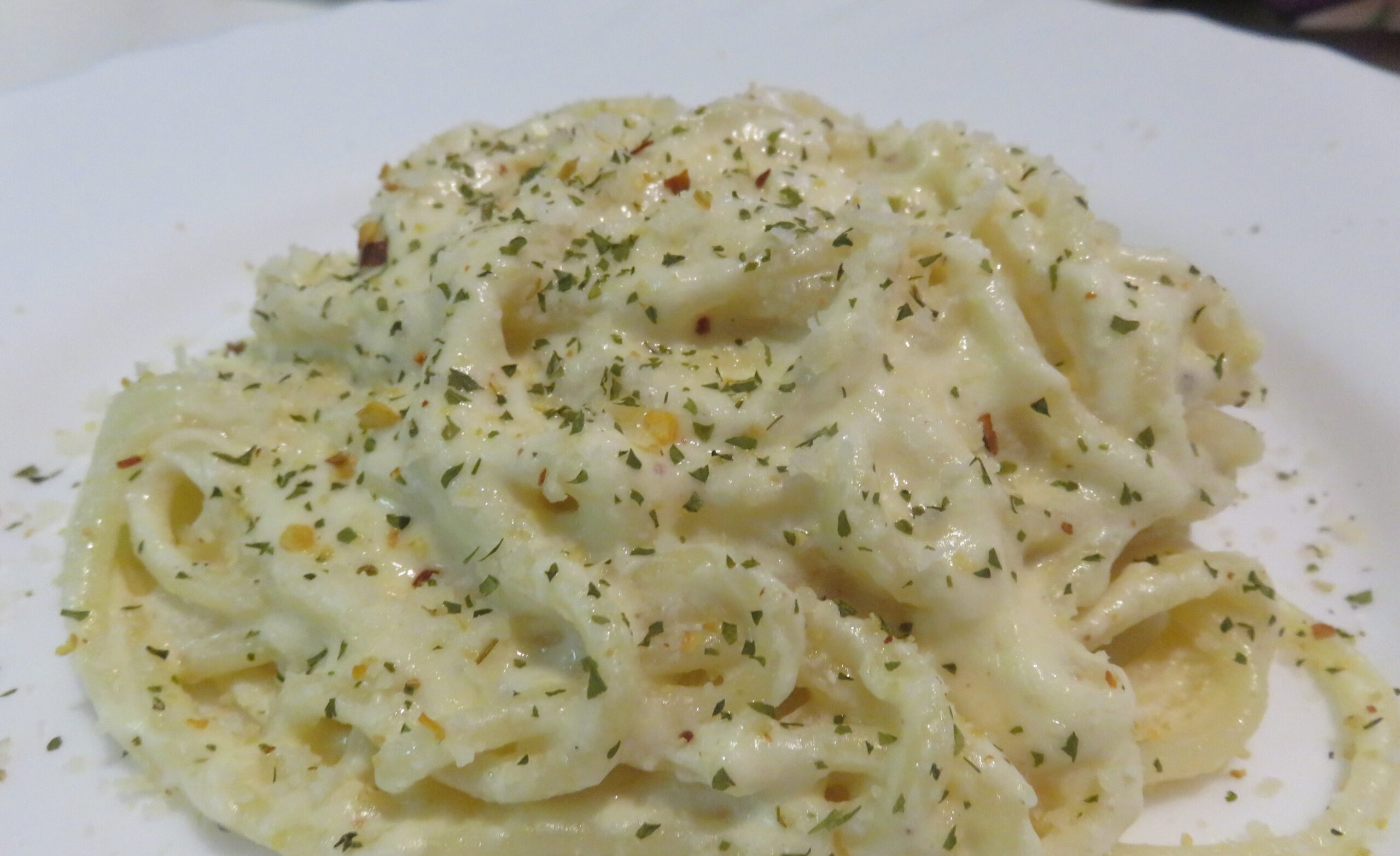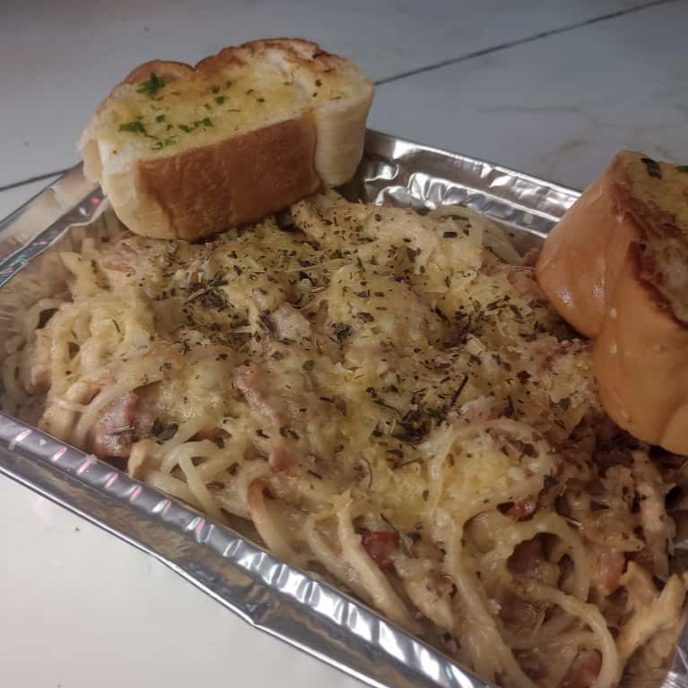 spaguetti con salsa blanca tocino, pollo , y queso