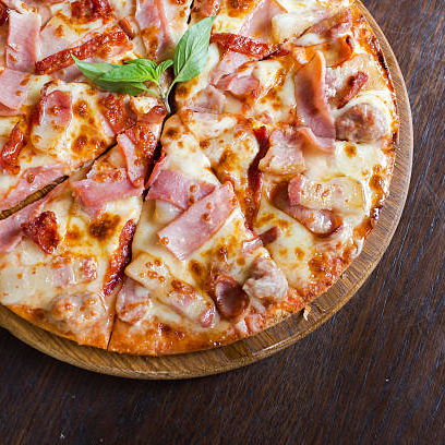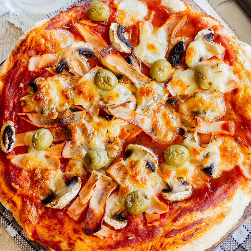 Deliciosa masa madurada, salsa pomodoro, queso mozzarella, jamón, champiñones, pimentón, cebolla y pepperoni.