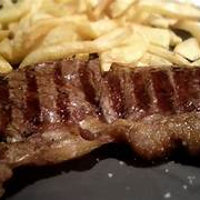vaquerito de carne asada , con papas a la francesa , ensalada .