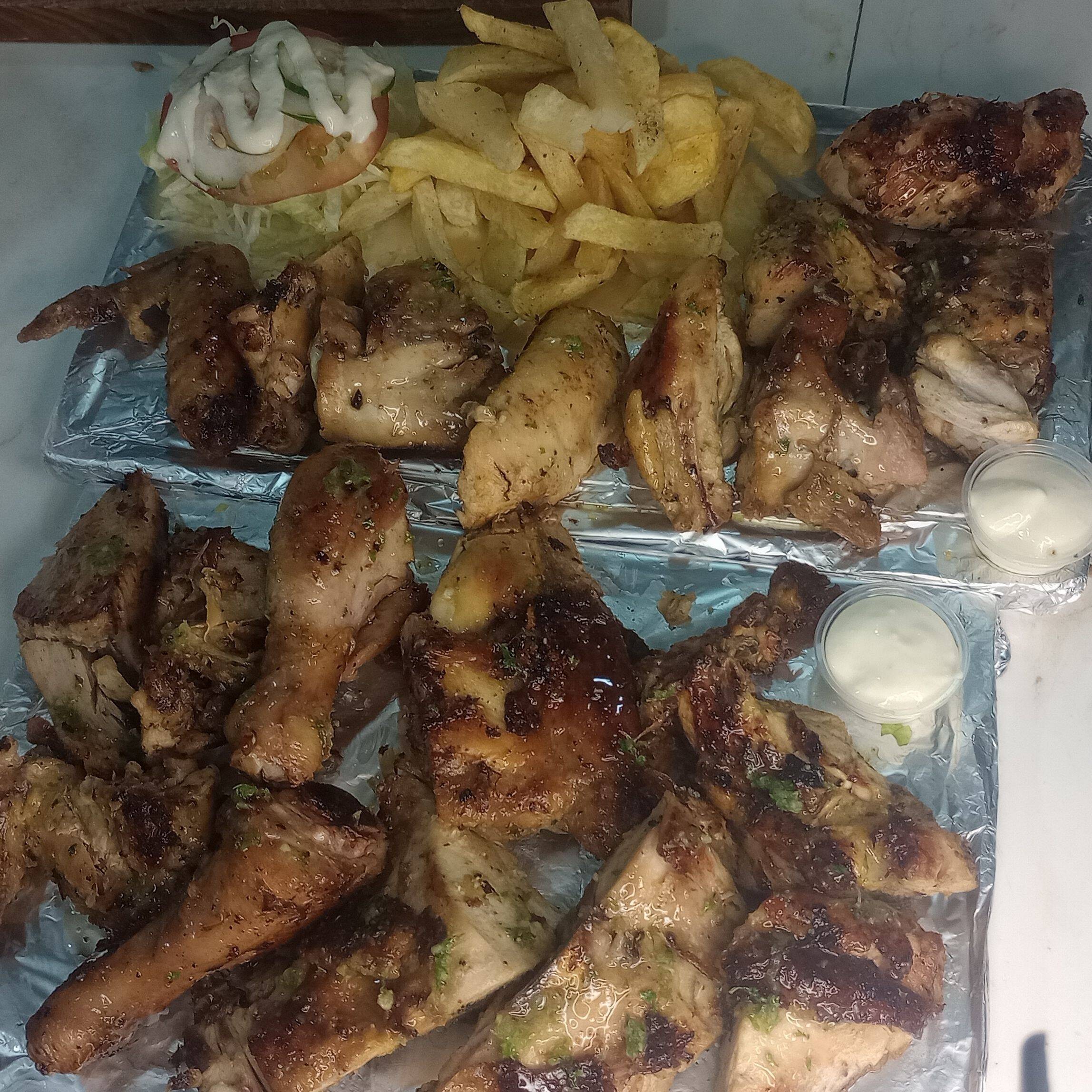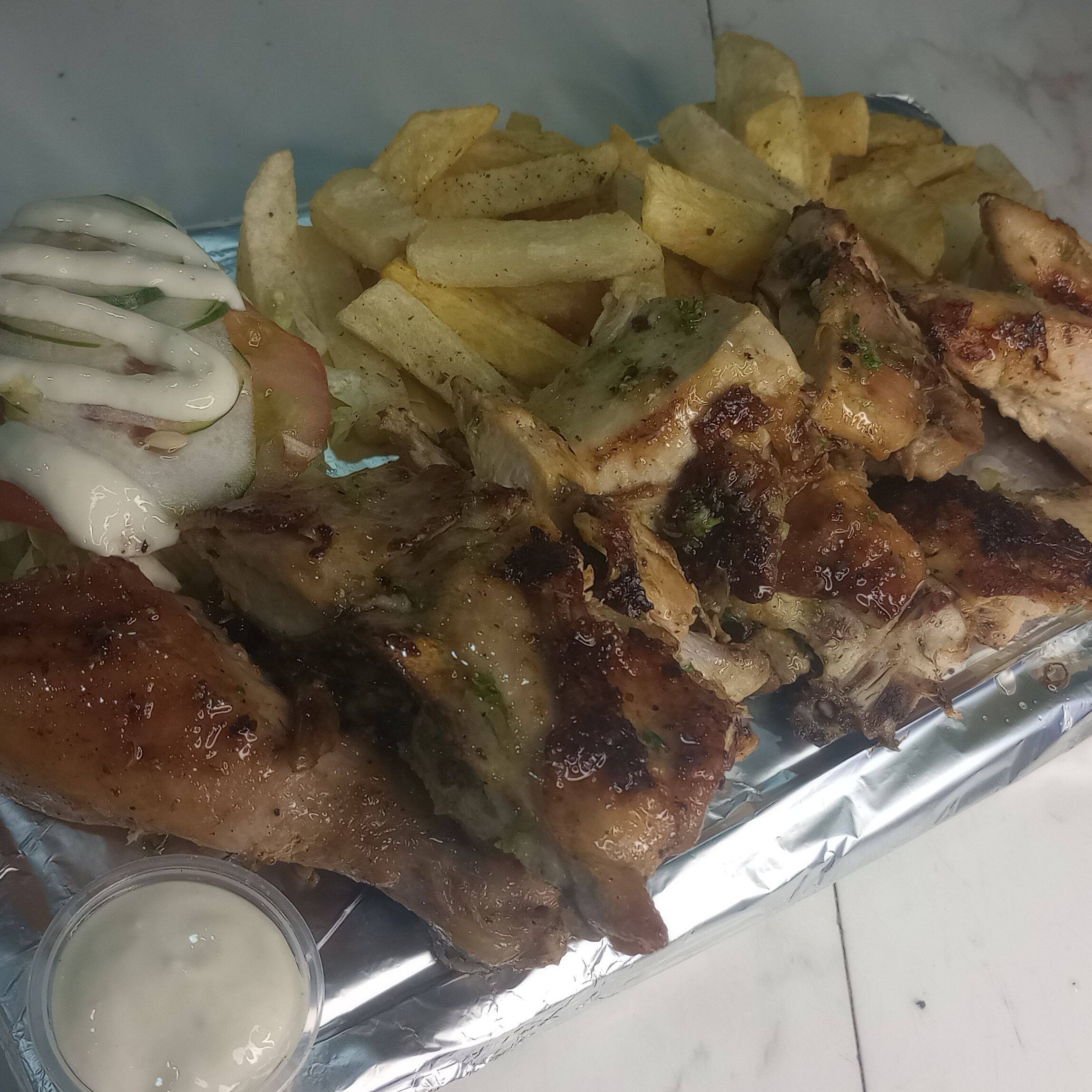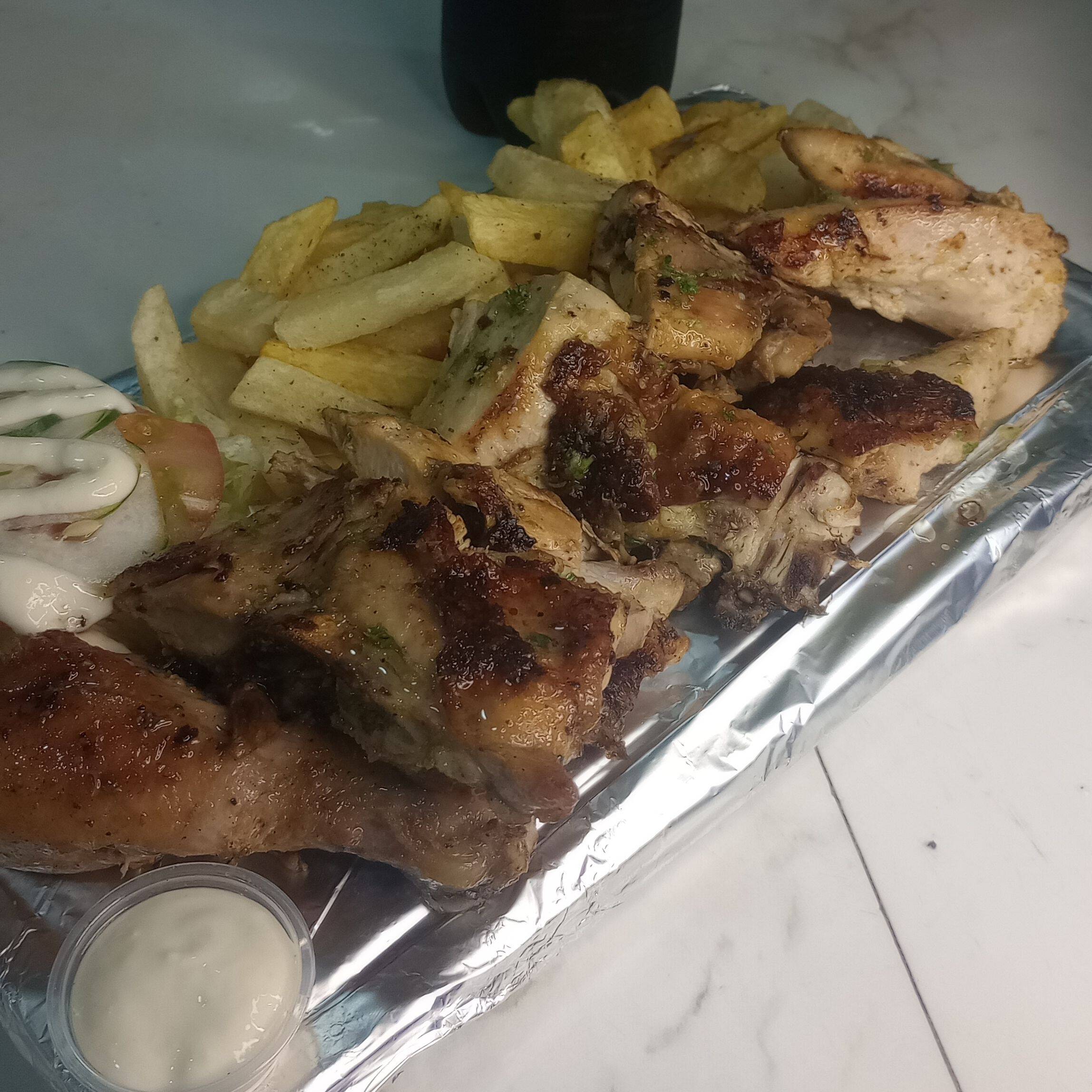 Medio pollo más papas francesa y ensalada salsa de ajo y salsa se tomate