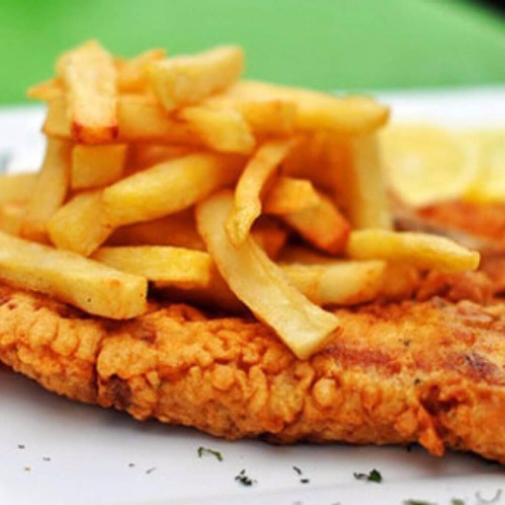 vaquerito de pechuga , con papas a la francesa , ensalada