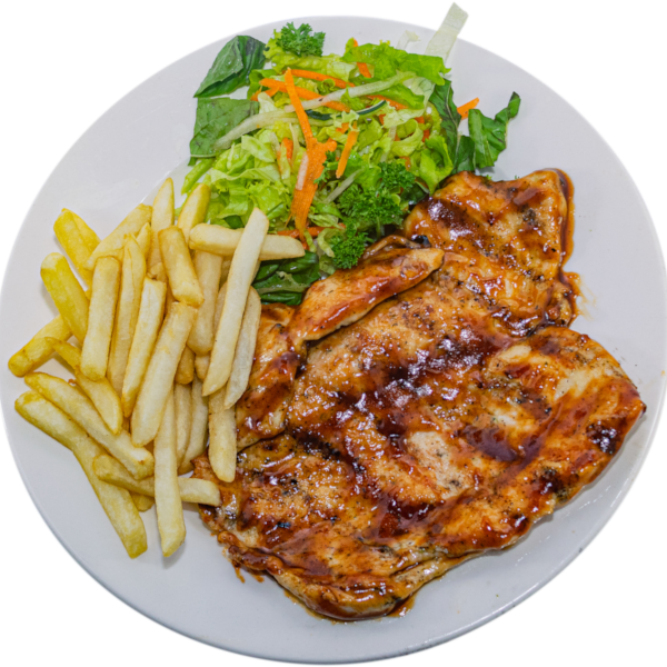 200 gr de pechuga de pollo al carbón , 170 gr de papas a la francesa, salsa tártara , y ensalada ( tomate, cebolla, lechuga)