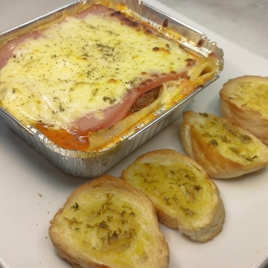 mini lasaña de carne con pan al ajillo