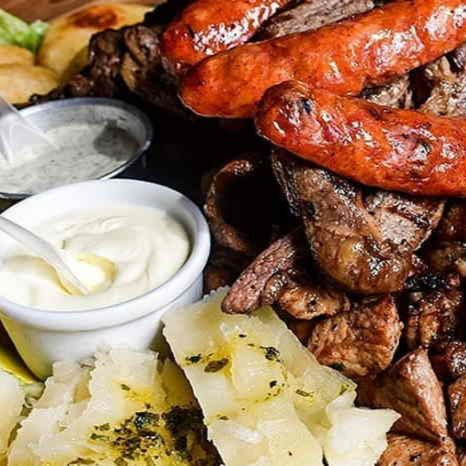 parrila al carbon , pechuga , carne , chorizo , morcilla chinchurria , cerdo , yuca ensalda , salsas