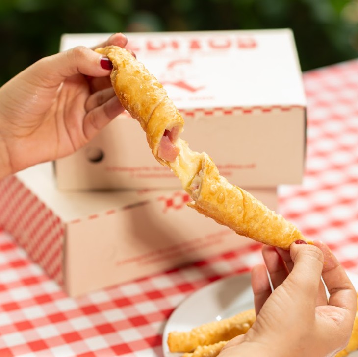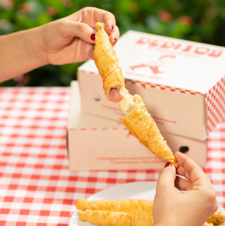 Dedito grande de masa de harina de trigo relleno de jamón y queso.