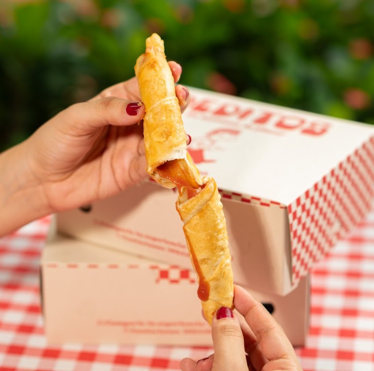 Dedito grande de masa de harina de trigo relleno de salchicha ranchera y queso.