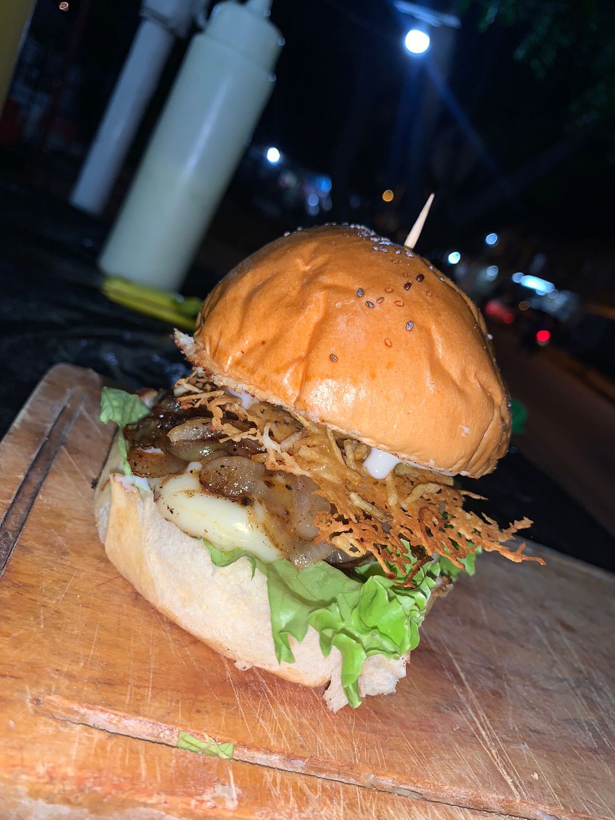 hamburguesa de carne cebolla caramelizada salsas de la casa