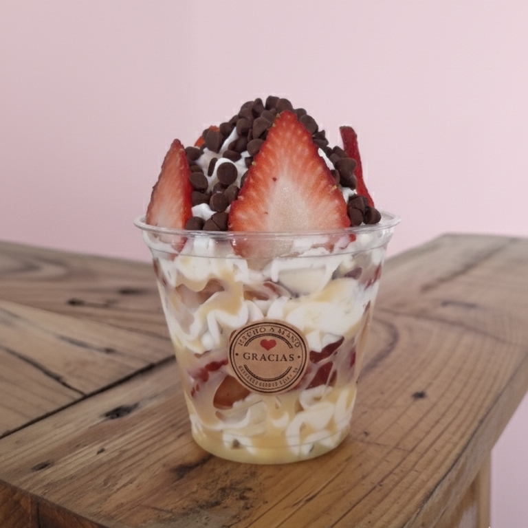 Una experiencia mas completa. Crema auténtica de la casa 0 empalagosa, fresa super fresca y jugosa y la combinación de toppings perfecta a tu gusto!!