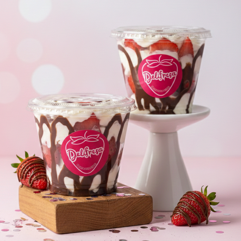 Deliciosas fresas con crema artesanal, salsa de tu preferencia y adicional de chips de chocolate negros.