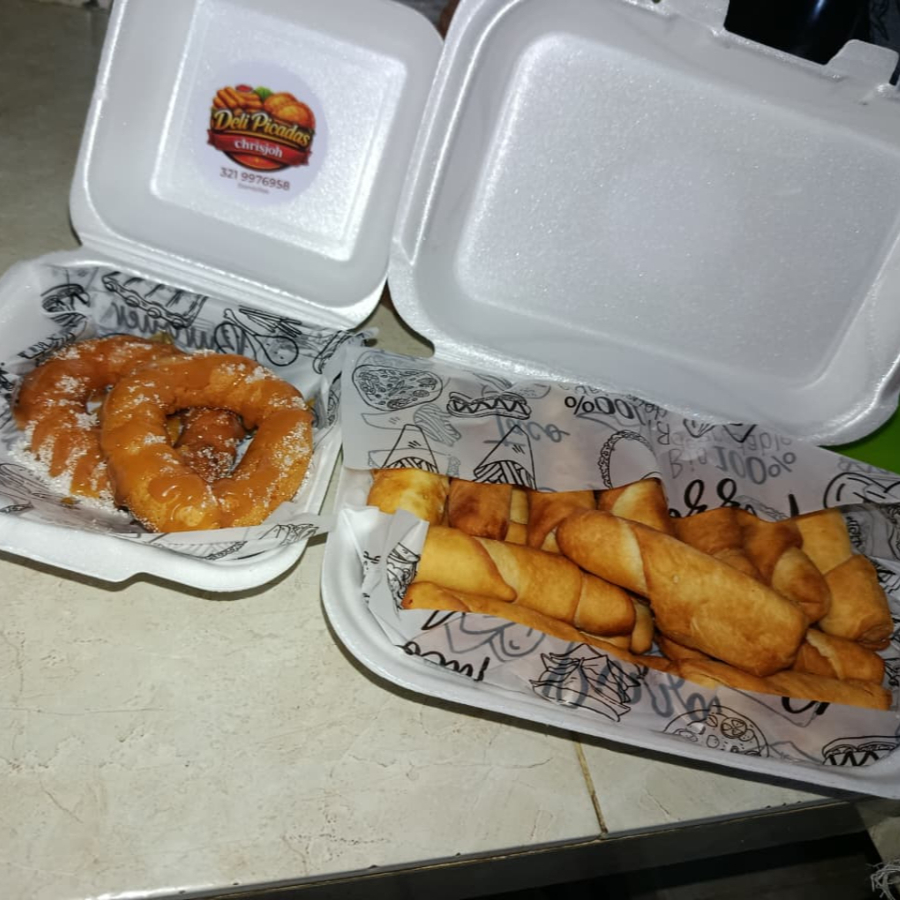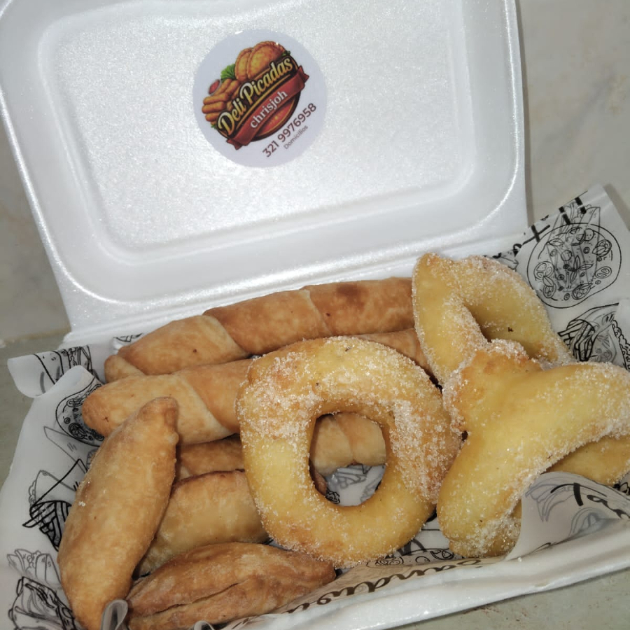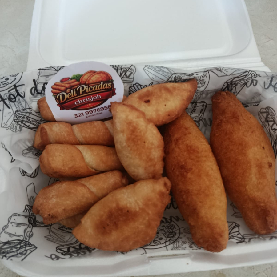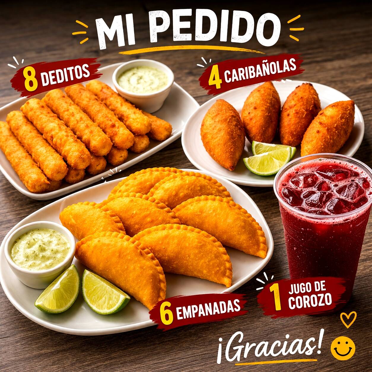 Deditos*8 + Empanadas (pollo, jamón y queso, hawaiana)*4 + Caribañolas*3 + Jugo de Corozo*1