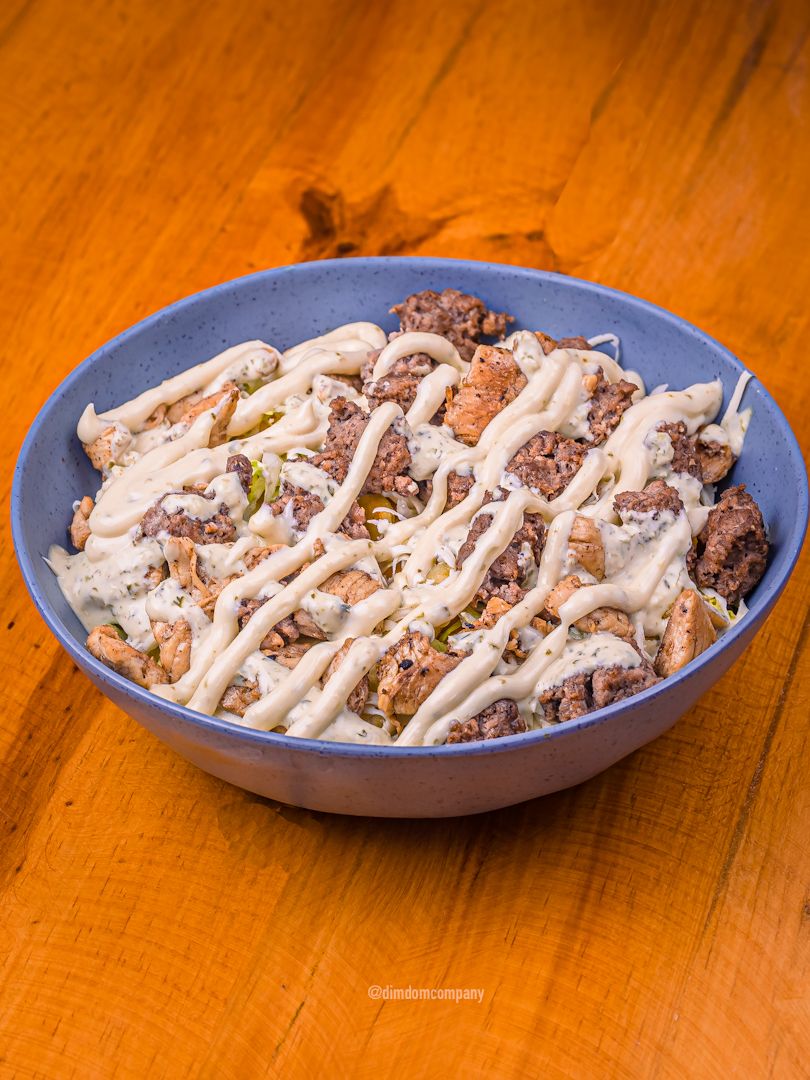 base de papas francesas 🍟 cama de lechuga 🥬 toques mínimos de cebolla morada para realzar sabores 🧅 cama de queso costeño 🧀 de proteína carne de burger 🍔 🥩 y pollo, acompañado de salsa tártara para hacer el match perfecto
