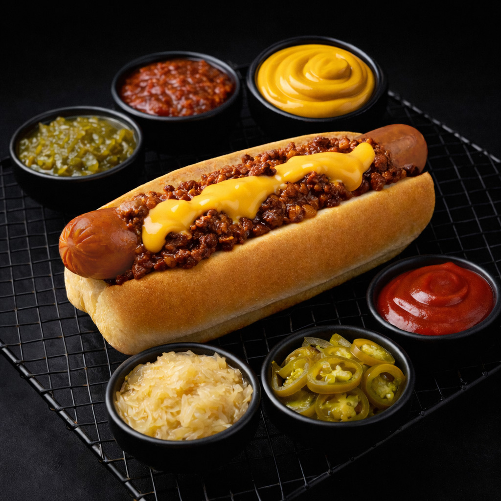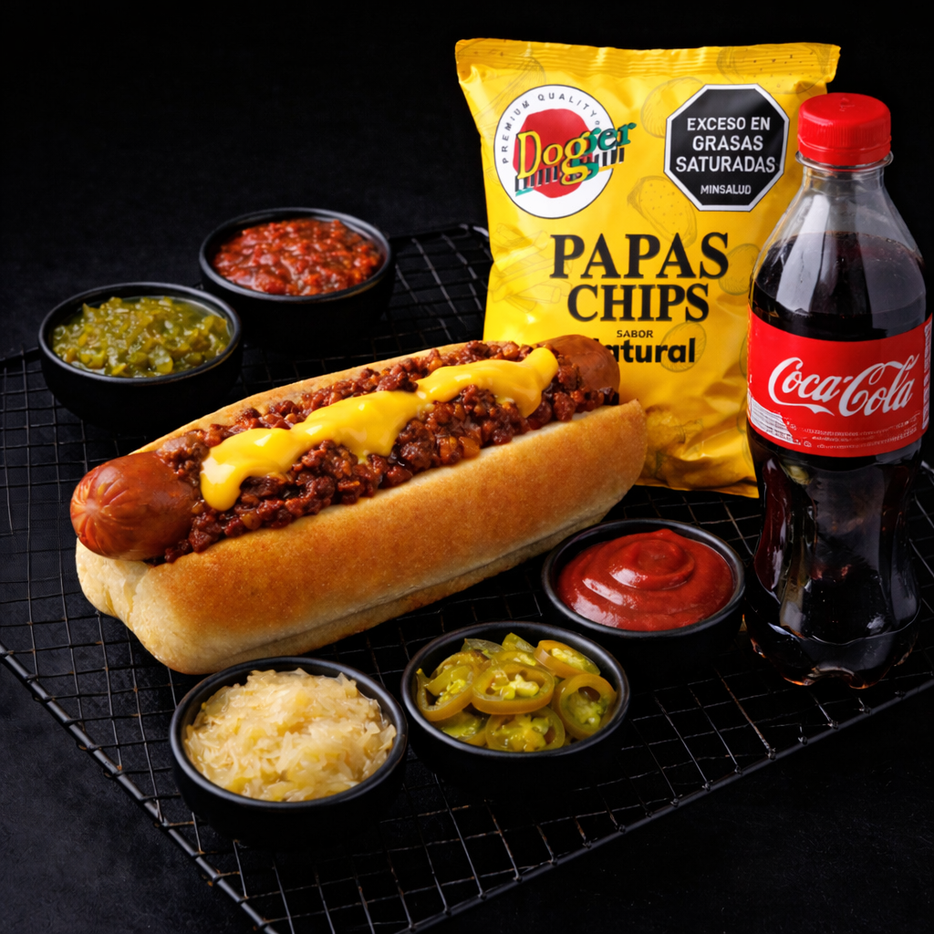 Delicioso hot dog con salchicha Dogger, chili y queso fundido (cada uno llega en recipiente de 1,5 Oz). Adiciones y toppings de tu elección.