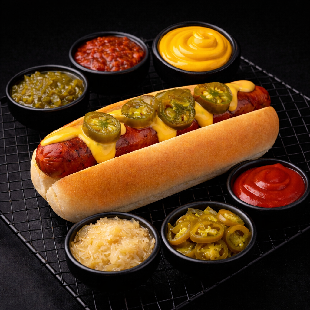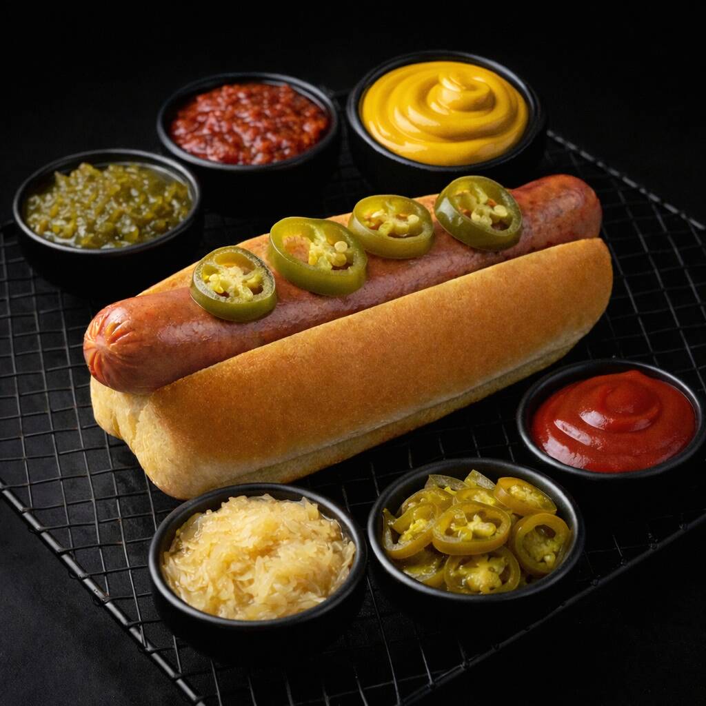 Delicioso hot dog con salchicha Dogger rellena de jalapeños. Adiciones y toppings de tu elección.