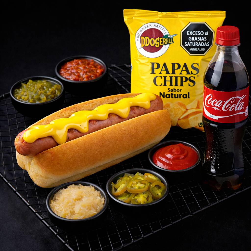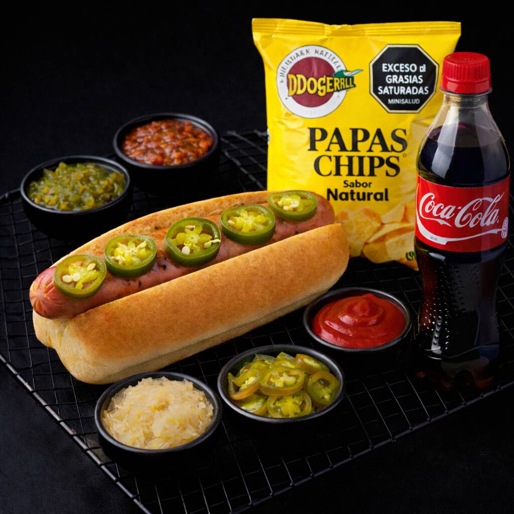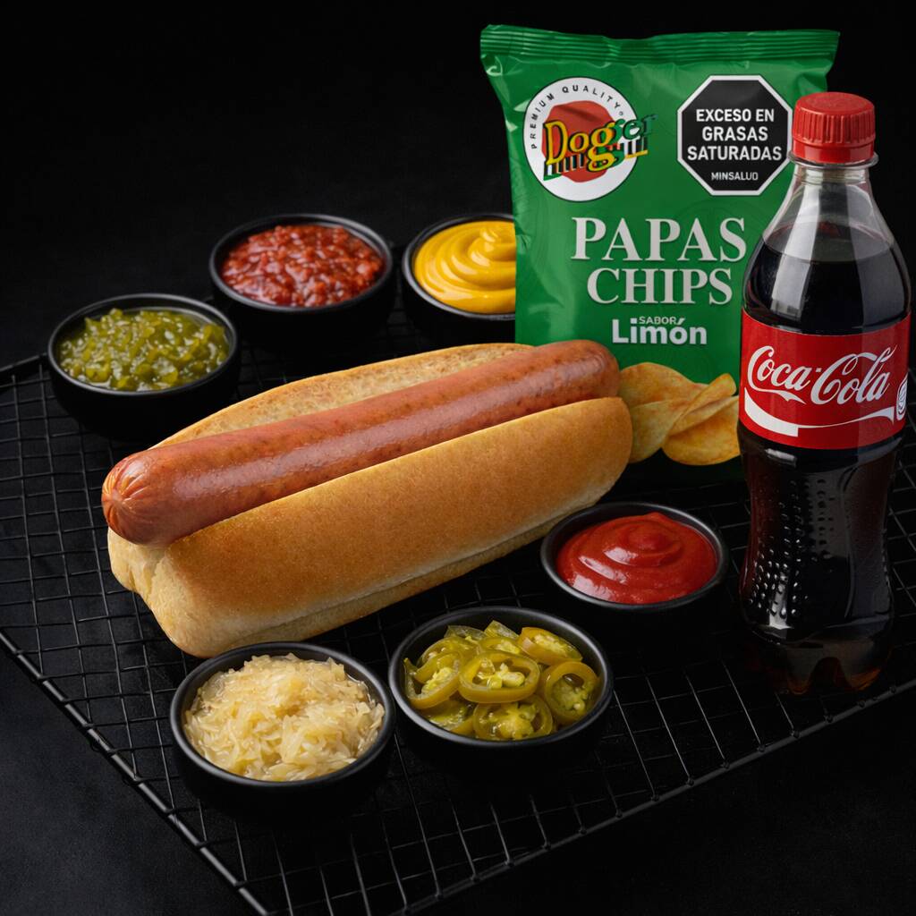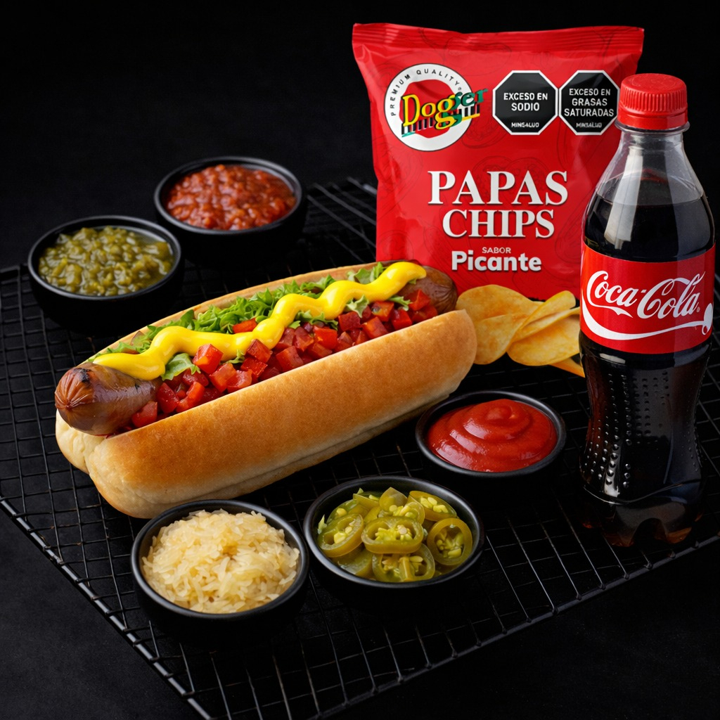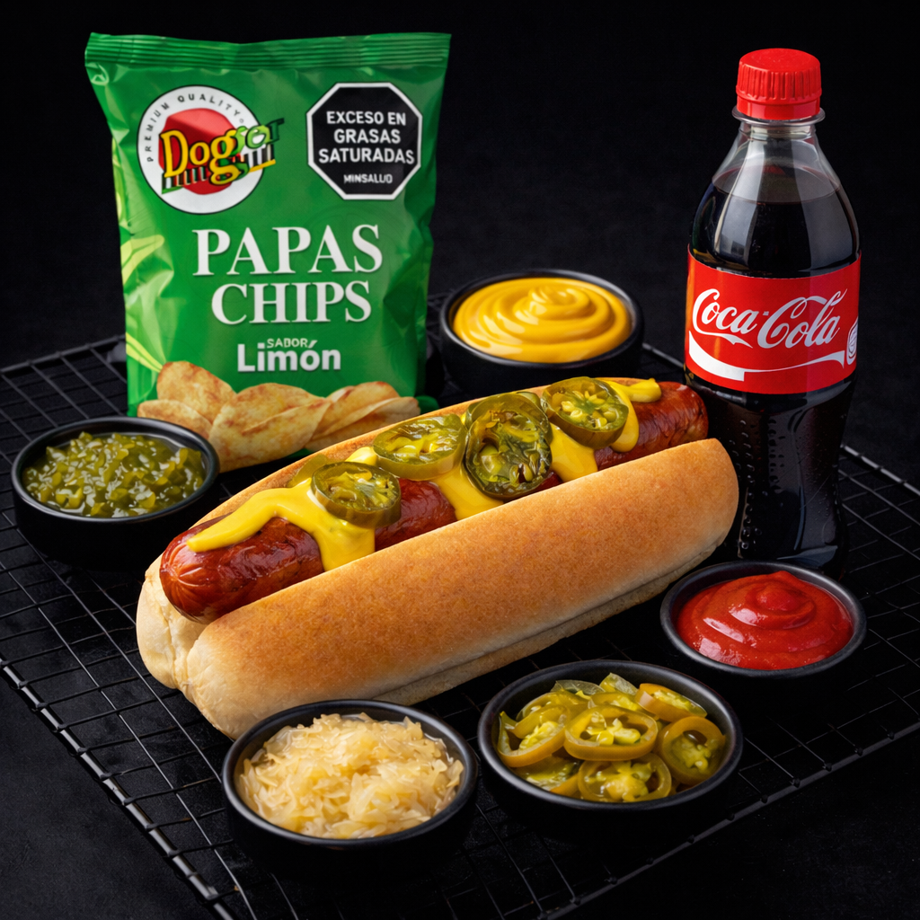 1 Dogger con salchicha rellena de Jalapeños + papas chips + gaseosa botella