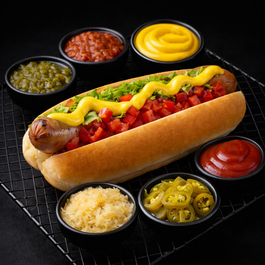Delicioso hot dog con salchicha Hamburdog. Adiciones y toppings de tu elección.